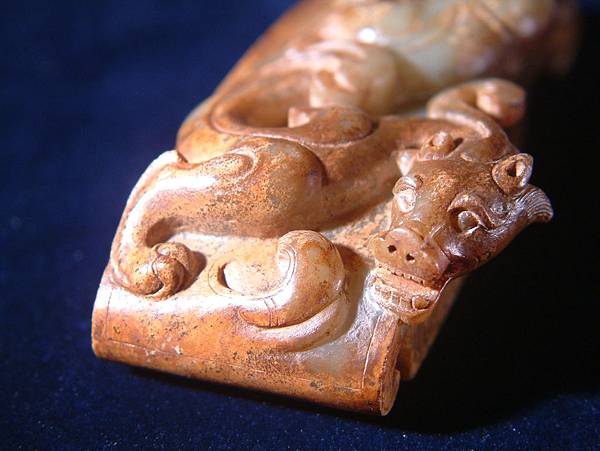 西漢青玉螭龍紋劍衛。螭龍濃眉、平吻、張口露牙,筒形耳後掠,腦後生一角向後卷曲。為能讓身軀呈現盤踞彎轉的靈動感,故四肢右前左後,以取得彎曲度。螭龍穿梭雲氣中,以示其神靈。全器受黃褐色沁。