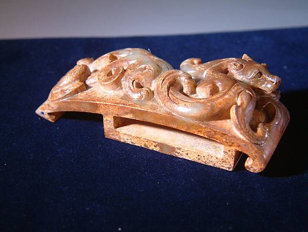 此螭龍吻部較長,眼視角向前,四肢粗壯有力,勾爪交待清楚,為西漢前期風格。另從其右前肢表面可看到大面積玉質質變萎縮,但有甚多小點仍維持原玉質、原色澤反而略顯凸起,這種自然的「台階」現象,為高古器時有出現的特徵。