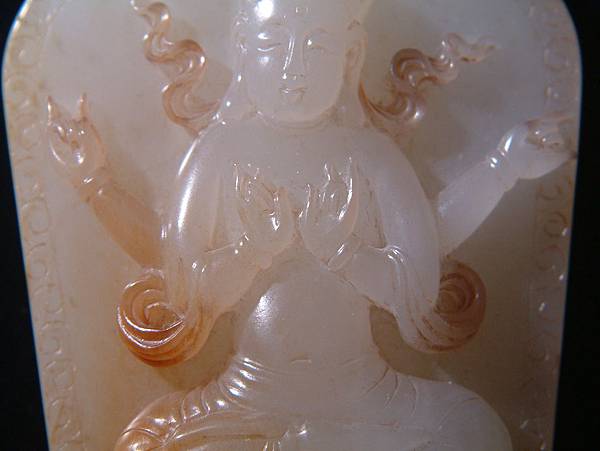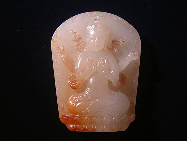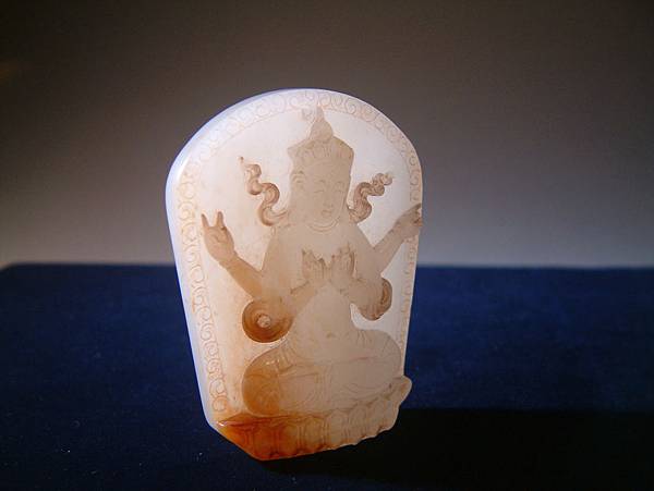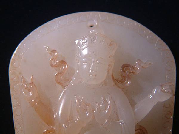 清仔玉藏式四臂觀世音菩薩像。乾隆期作工,藏傳形式,笑眼閉垂,四臂各打手印,天衣纏臂至肩後上飄,趺坐蓮台。背光邊緣以陰線琢卷雲紋。本器為高浮雕作法,略厚,故除了可作隨身掛繫,亦可作置於案上膜拜。正面部份區域人工燻紅,以現古意,此為乾隆前、中期的常見特徵,因為當時乾隆尚古,對一般走奇巧形態的玉器很不以為然。故玉工自然需投其所好。
