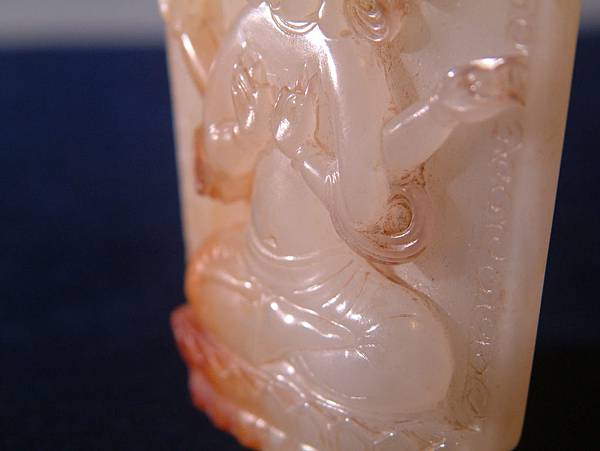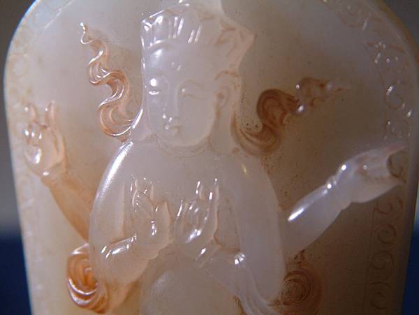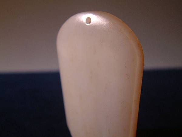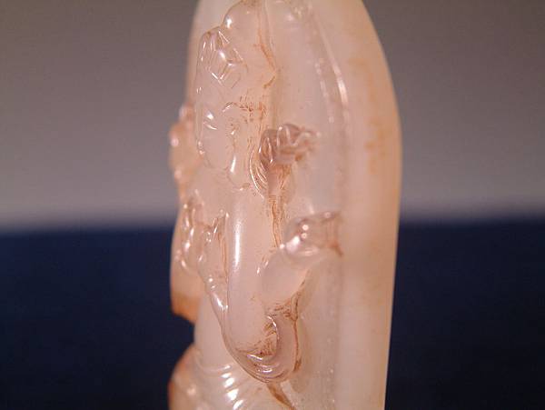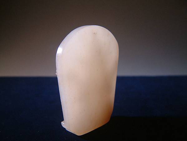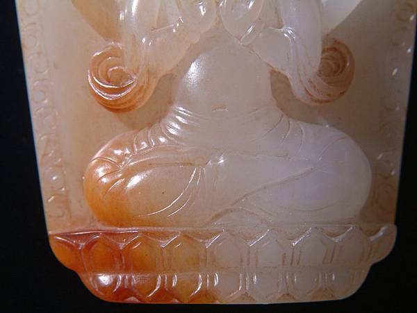 玉質極佳,為和闐仔兒玉,潤透Q滑,上手頗沉。器上端琢有繫孔,可配掛於身。亦可平穩置於龕案或神桌上,以為膜拜。應為皇室隨身的佛教聖物。