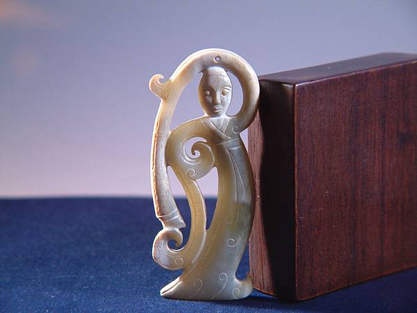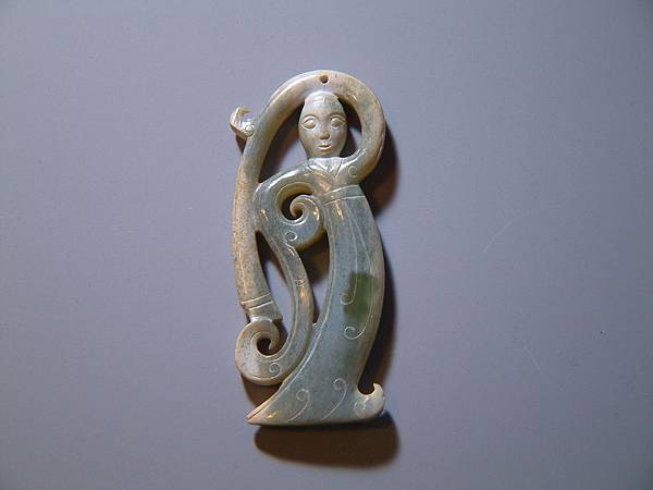 西漢青黃玉舞人珮,青黃玉質,棗形眼,深衣長袖,右手插腰大袖下垂後擺回卷,左手向右拋袖過頭至腳側,頭上有一穿供配繫。以陰線加強其衣服紋飾,全器數處白化較重,但光澤仍強。