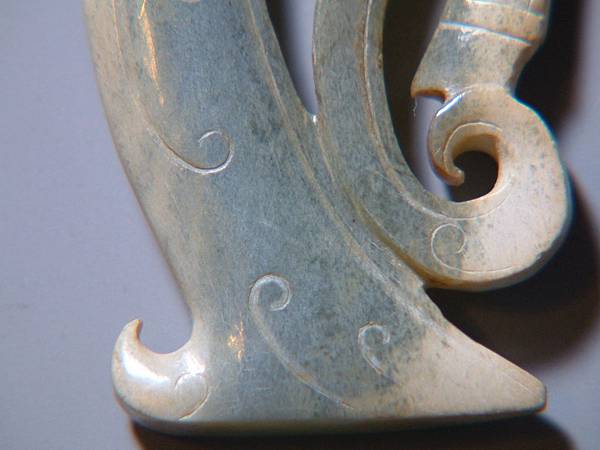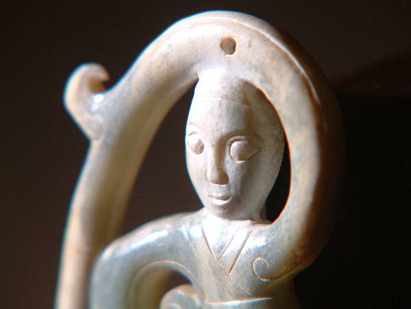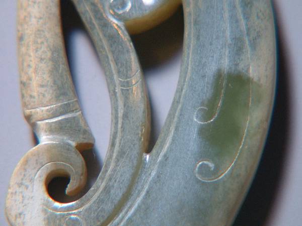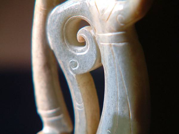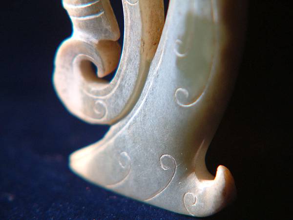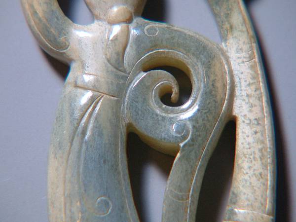 由這張照片可以看到,此處的陰線處理有三種手法,仕女右袖末端逆時針旋轉的陰線,是接近「游絲描」的極細陰線,可增加條紋的複雜度與平衡袖子最末端反時針走向的視覺張力。長裙膝後的陰線則在陰線的下側略為琢出小斜坡,使光影作用下讓條紋形象清晰。裙下擺則在陰線的一側琢出大斜坡,讓觀者雖然最容易看到此條紋,卻在視覺上反而模糊化,使觀者的注意力仍集中在玉器中央部分,這樣的設計與手法難道不高超?