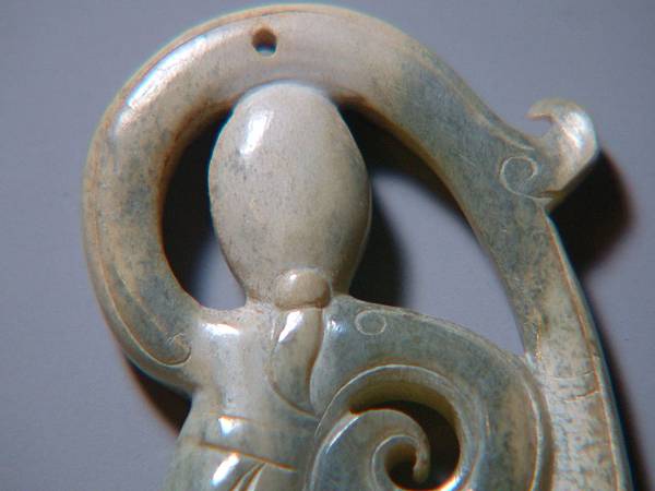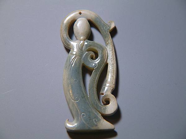有種說法是舞人甩袖過頭後垂至腿側屬「戰國」器,過頭袖若僅至頭側,則為漢代之玉器。事實上,戰國器有至頭側的。漢代出土器也有如本器甩袖過頭過腰的。故過不過頭實非斷代之依據。