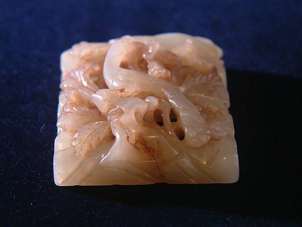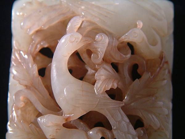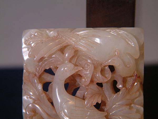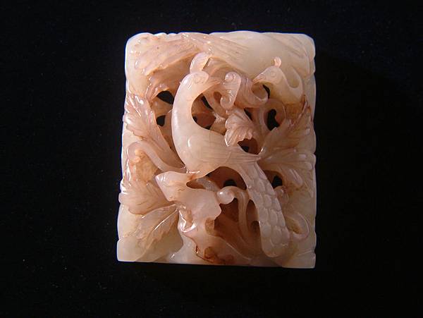 宋白仔兒玉鸞鳳呈祥珮。本器上緣雕琢一隻棲於枝葉上的青鸞鳥,向下探頭望著站立在太湖石上的鳳鳥,鳳鳥回首嘴啣著靈芝,似要將此珍貴寶物送給青鸞鳥,喻意夫妻情深、吉祥如意。本器採多層次鏤雕的技術,成功地將「 鸞鳳合鳴」的恩愛情景呈現出來。上手沉、玉質光瑩通透,應為和闐白仔兒玉,全器略有紅沁,必為前主心愛貼身之物。推測應為週邊包金、銀框的隨身配玉。