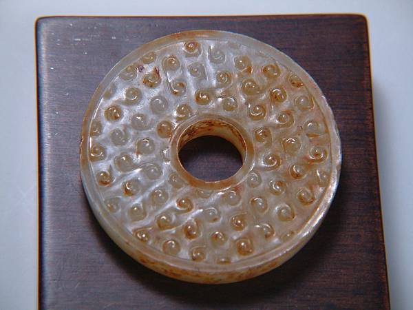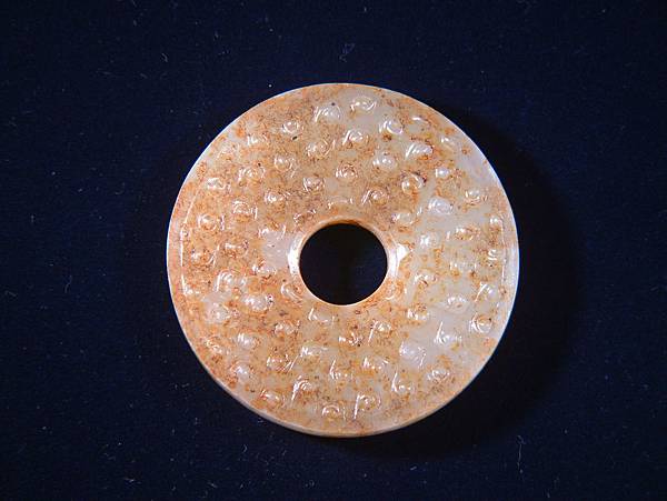 和闐白玉穀紋系璧。穀紋飽滿,內外緣琢斜坡廓紋,紋飾單純,器表大部份受鐵沁呈紅褐色。為貴族隋身佩飾器。