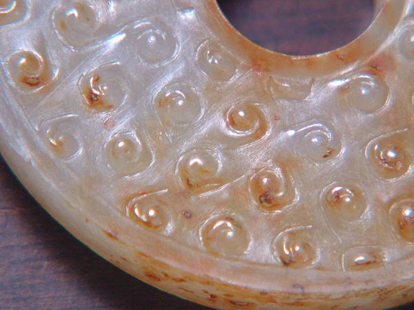 此處我們還是從俗,稱為穀紋。穀紋出芽側略呈方圓形,其出芽與穀紋本體較為外張。戰國中期與西漢中期之間,亦有穀紋之出芽貼近穀紋本體,觀之似乎較為旋緊,此種穀紋間之地子打磨平整。本器雖琢出各個分明的穀紋,惟地子打磨不夠平整,應是繫璧原本面積極小,紋飾間空間有限所致。