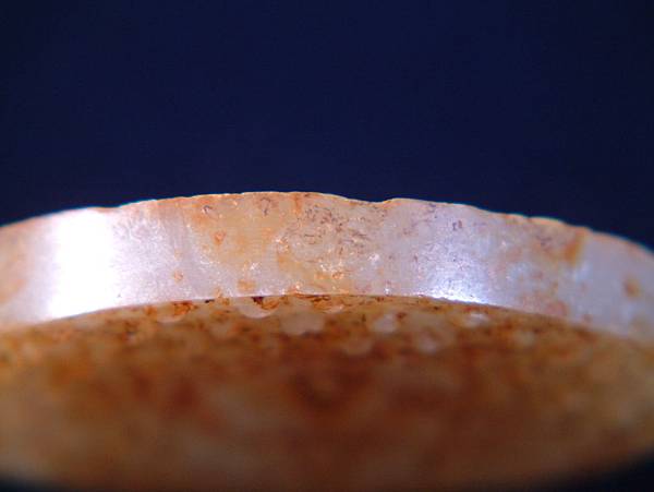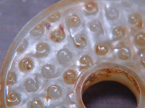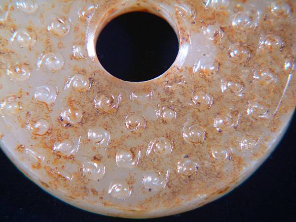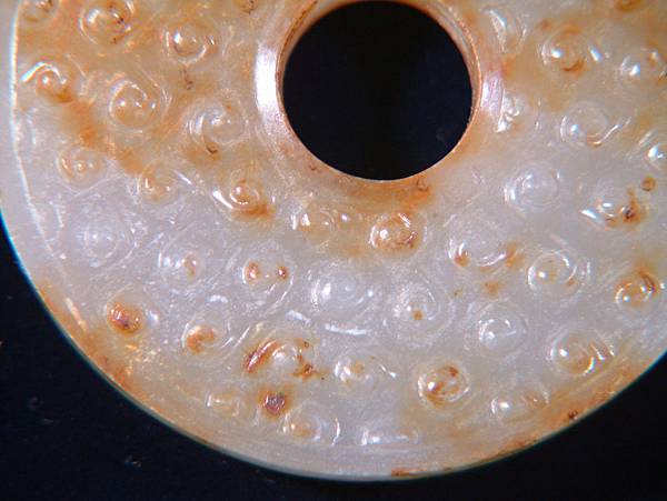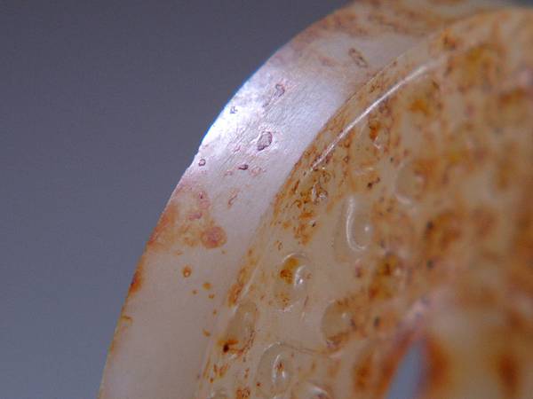 本器受鐵沁較重,鐵銹與玉緊密結合,不易剝除,故保留原味。本器白玉質地甚佳,經鐵沁只在表面留有亞化鐵離子的銹斑,且入手頗沉,應是仔兒玉質。穀紋浮凸圓潤,雕琢亦頗用心,為西漢繫璧之精品。