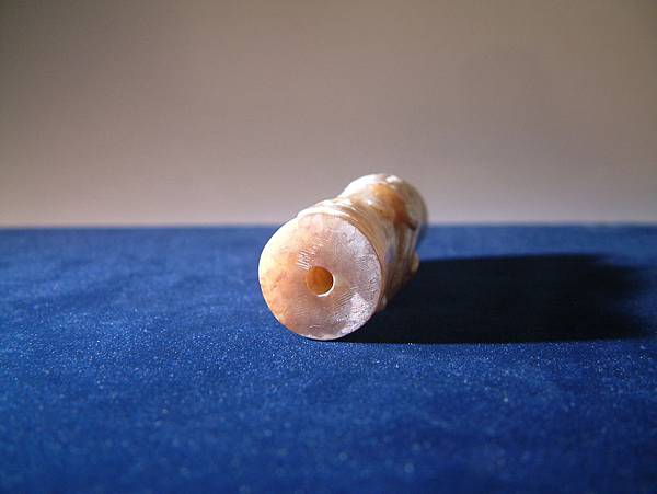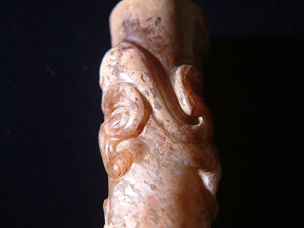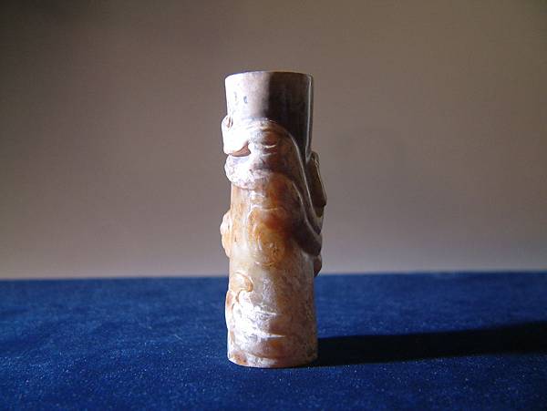 西漢白玉螭龍紋勒子。本器紋飾簡單,只有一隻螭紋與雲氣紋二樣。螭龍攀爬在勒子上一圈,上下各有雲氣紋,以增加螭的神靈性。為白仔兒玉,質地通透潤澤,上端受沁,已呈暗褐色,多處灰皮。此器為西漢王族隨身佩帶的組玉最下緣的一件,亦可單獨穿絲繩配戴。