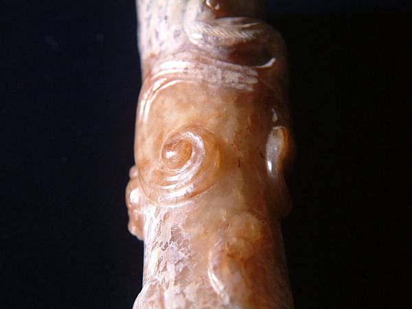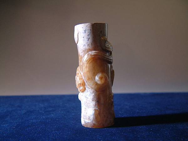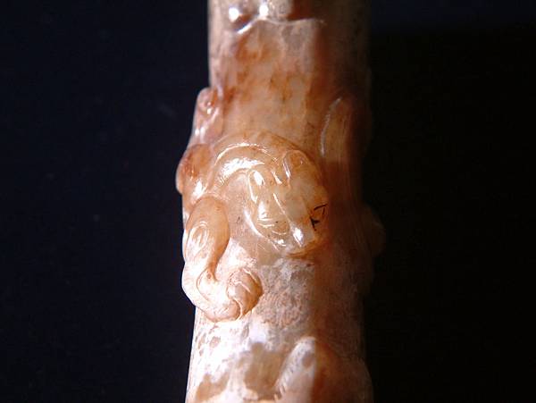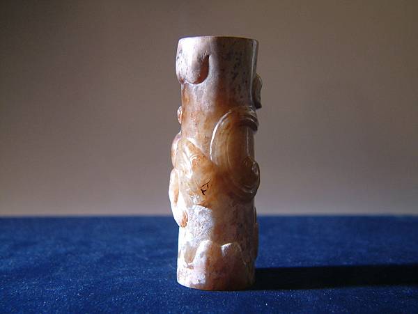 本器琢有天地鑽,典型勒子。本格其他「螭紋勒」螭紋風格有明顯差異,本器較接近山東省巨野縣紅土山漢墓出土物之風格。