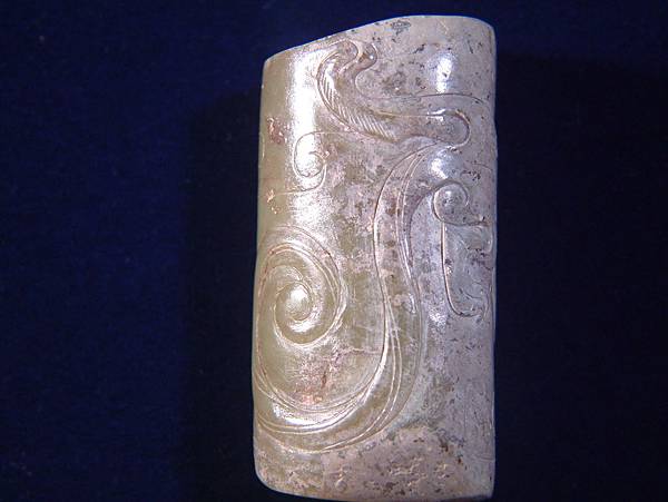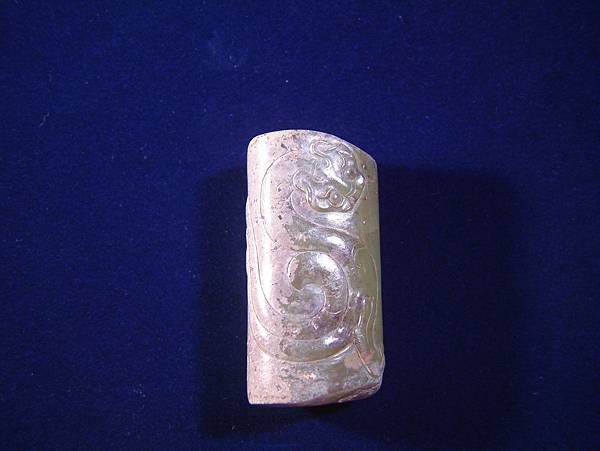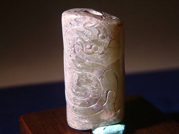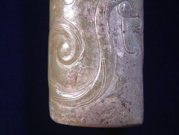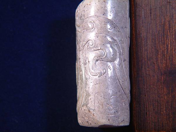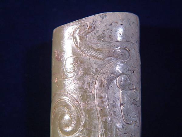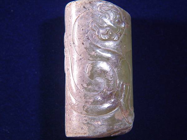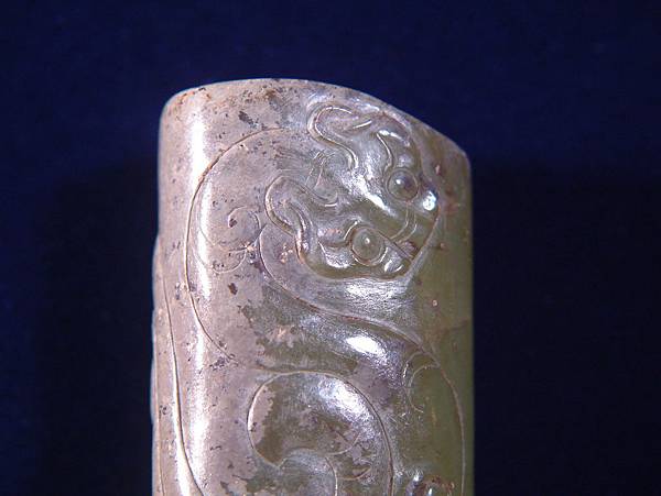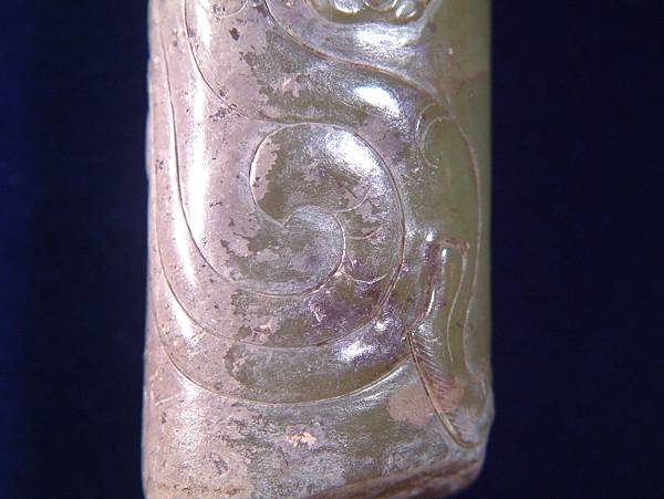雖有質變灰皮,仍可清楚見此器青玉潤透。本器雖不若前篇發表的「西漢白玉螭龍紋勒子」來的紋飾浮凸、複雜,用的也不是西漢主流的白玉,但本器的精、氣、神仍相當突出,也多了些粗獷、自然的風味。
