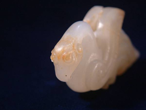 翅、尾羽紋以圓凸之長羽紋表現,僅以「二字紋」略示節段,手法較粗獷。西漢的禽鳥或朱雀等玉雕,似乎常見這種圓凸的長羽紋,讓想起wake想起西漢的避邪、螭龍等神獸的玉器尾部,常見有反向的圓凹絞繩紋,是否是當時有意區別陰陽的時代風格?以大卷渦紋表現大關節為漢代動物玉器之手法。