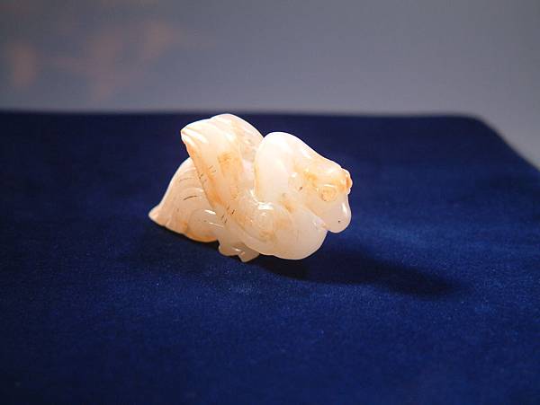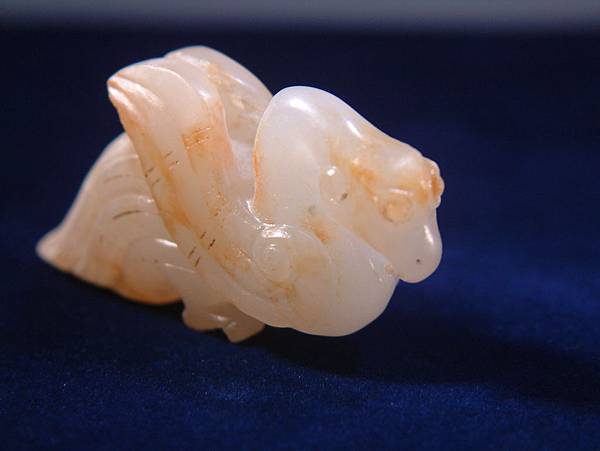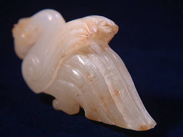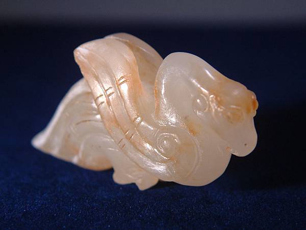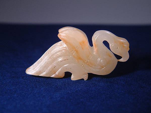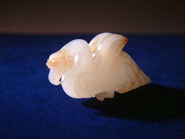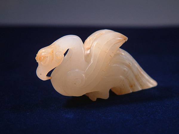 西漢白玉鸕鷀珮。白玉質,鸕鷀為善補魚的大型水鳥,至今雲貴仍有漁家豢養以協助補魚。此器為雕刻鸕鷀盯上獵物,揚翅正欲鑽入水中的剎那間。