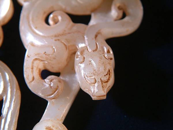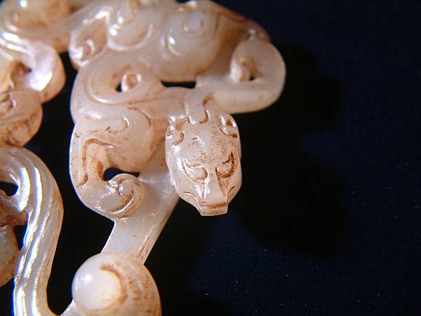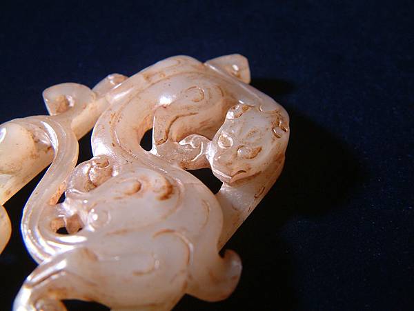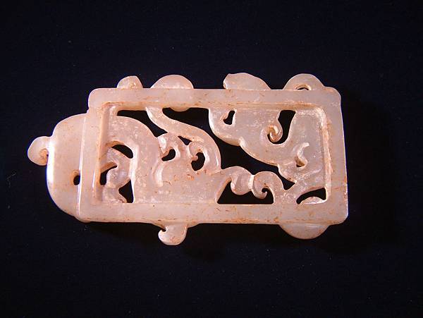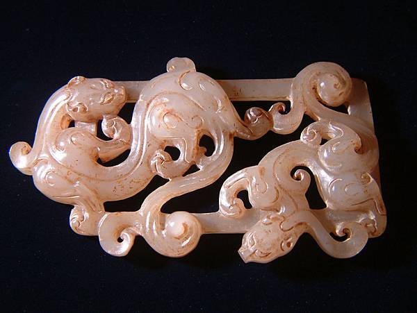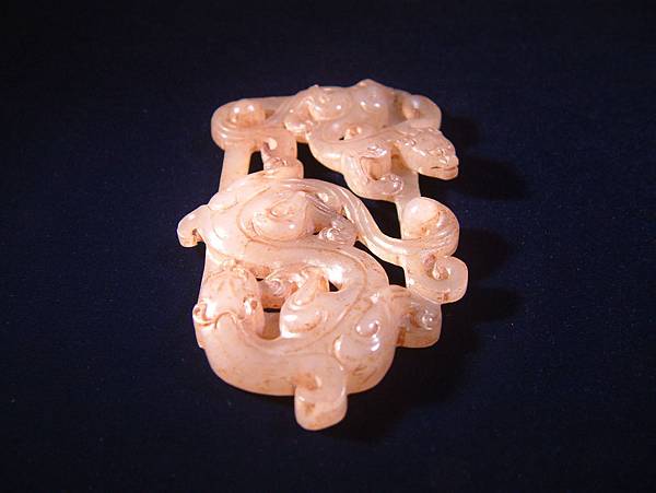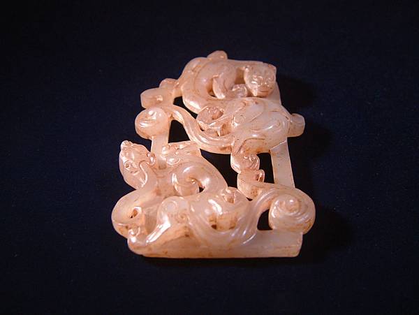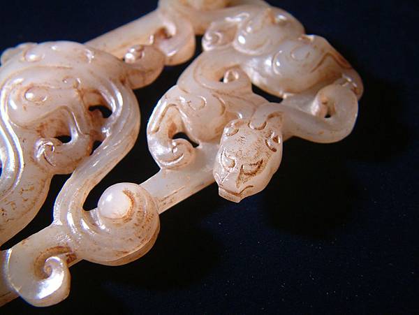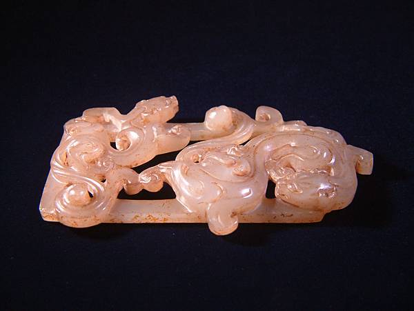 西漢白玉鏤雕雙螭紋帶扣。扣框上琢浮雕大小螭龍各一,身軀扭轉靈動,兩螭斜斜相對,布局非常自然。為貴族皮帶上之扣頭,全器光滑透亮,白玉質硬度頗高。