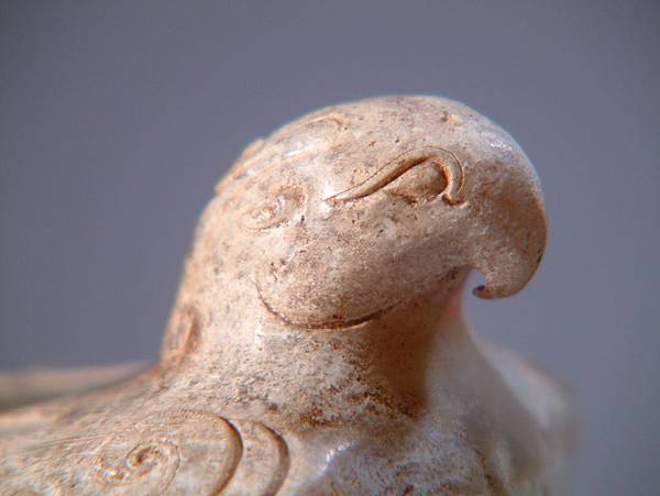 眼上琢一較深陰線,非常技巧的將眼皮突顯出來,增加其眼深度,有如現代割雙眼皮美容手術一般。勾喙與頭部無明顯區隔。