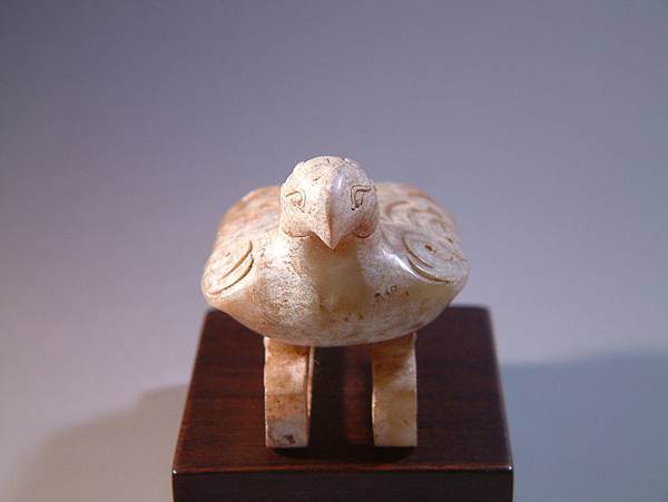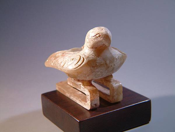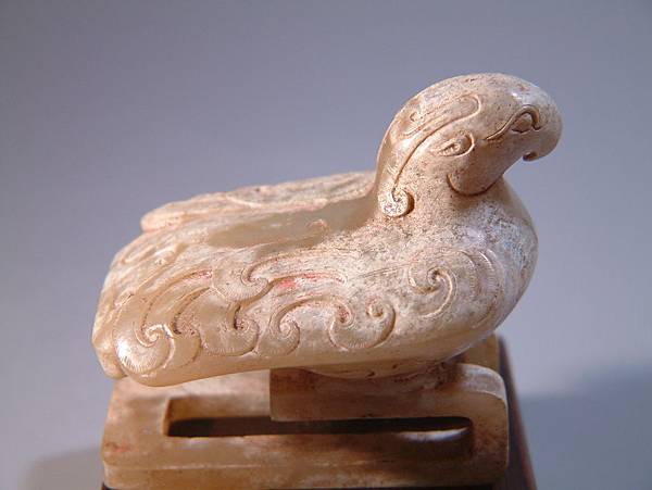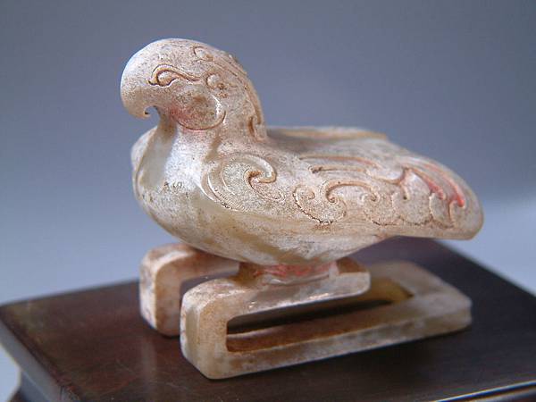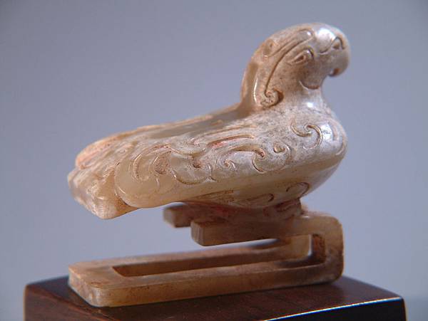 西漢白玉鳳形扣。白玉質,棗形眼,勾喙,型態成棲息遠望狀,表面部分白化現象,有硃砂沁。