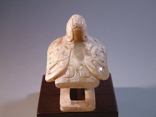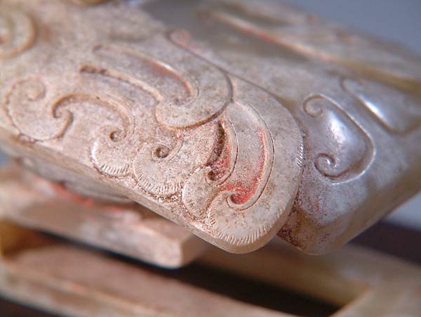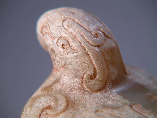尾部以三角勾連紋(有專家認為是簡化之雙鳳紋)代表尾翼,造型與扣框設計為長方型,略顯剛硬。故2000年前的琢玉師傅很技巧的設計雙翅勾捲羽紋均自內向外側轉出,但至羽端又勾捲回內側,這又是蔡慶良博士所說的西漢玉工善用的視覺張力處理手法,讓我們看這些不規律的紋飾時,視覺的不是雜亂,而是靈動與力道。