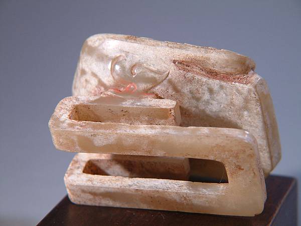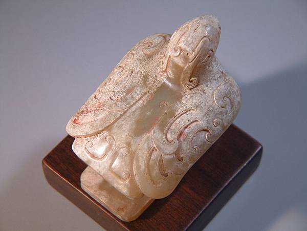 此器風格不同於西漢玉雕動物之動作中造型,亦不猙獰兇猛,反到是一派安寧祥和狀,可能為西漢前、中期器。整體風格看來置於冠髮之上較為適合。