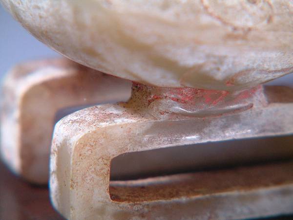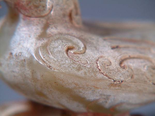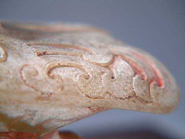 此鳳全器白化較重,朱砂沁蝕可能是主因。羽紋末端琢短陰線表示羽毛的感覺。