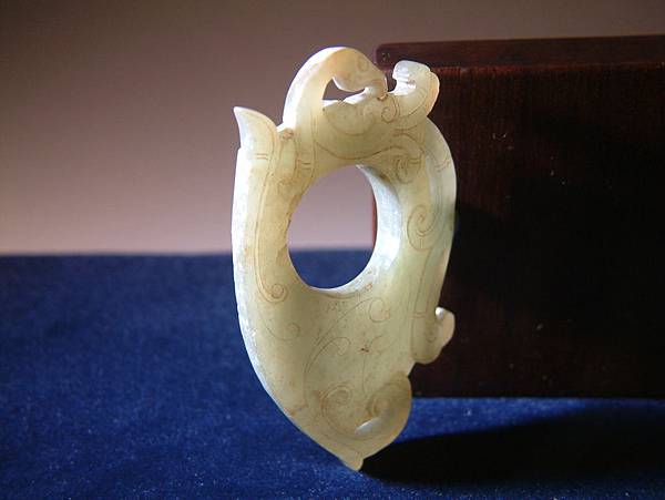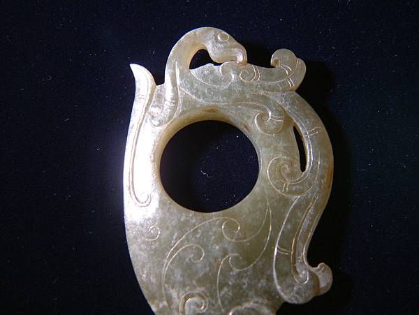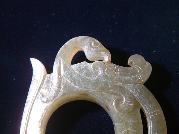 鳳型簡約有力。鳳頭勾轉回韘體,除了形成自然的一繫穿孔之外,亦是西漢玉雕師慣用的將視覺張力轉回玉器本體的一種手法。
