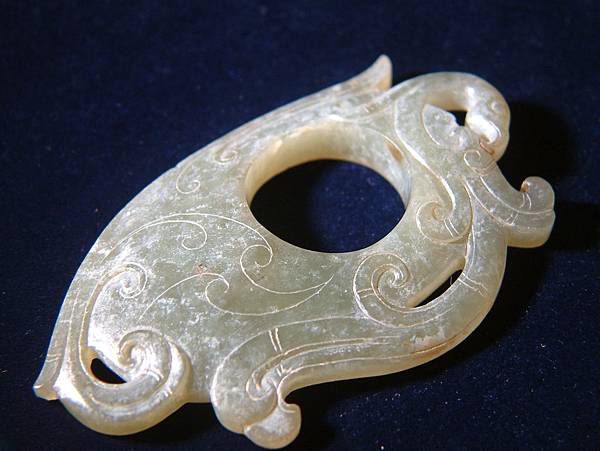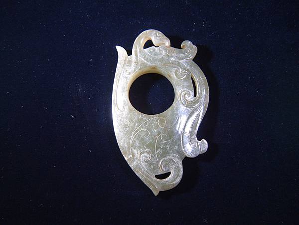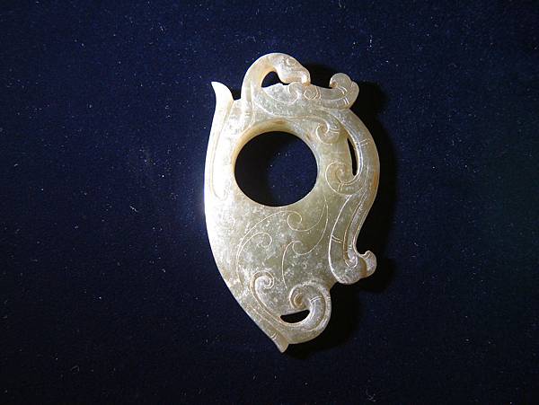 西漢清玉鳳紋韘形珮。本器以壓扁變形之韘為主體,韘周邊雕琢出鳳紋及雲氣紋,器表面另以陰線琢出雲氣紋路,背面無紋飾。器表略有風化痕跡,但全器仍光耀通透,玉質為和闐青玉。