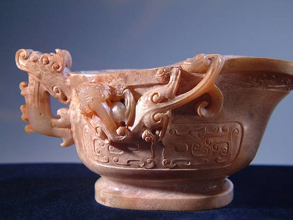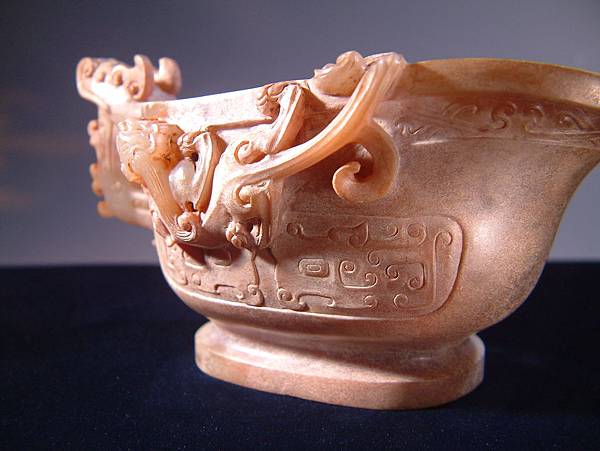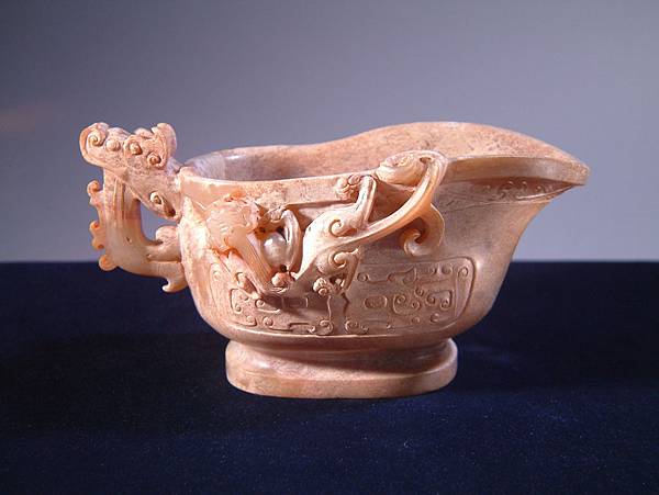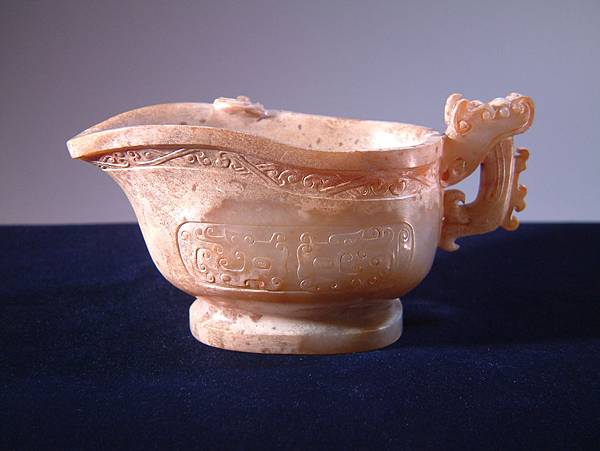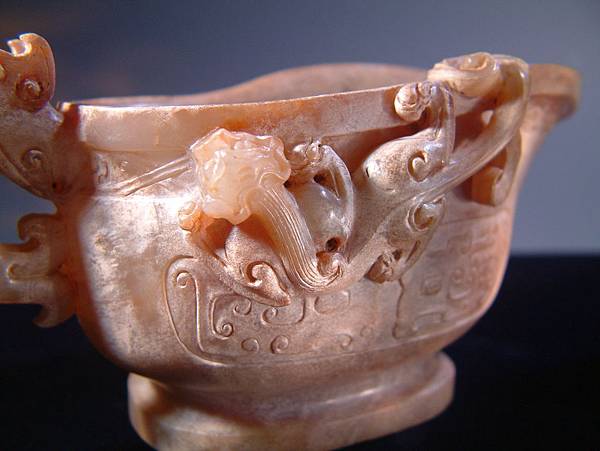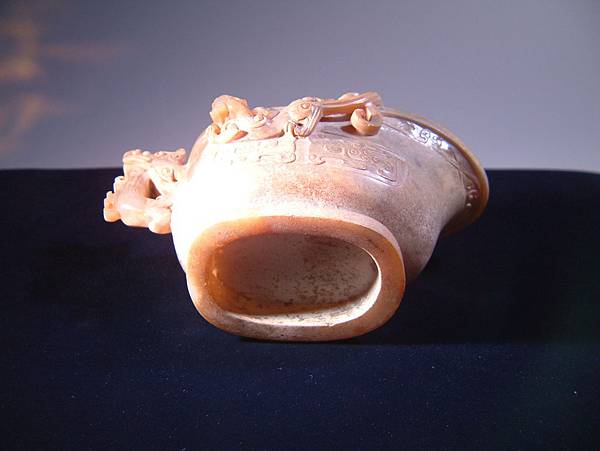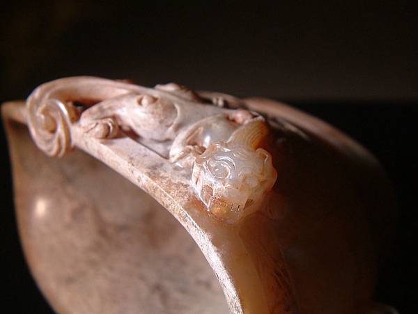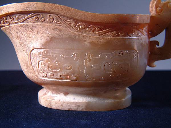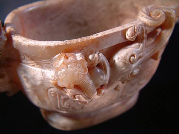 全器雕工精緻,一絲不茍,地子打磨精細,紋飾布置華麗又不至於過度繁複,屬於西漢前、中期的玉器元素,充滿了貴氣。本器應是西漢王室專用的酒器,一般貴族應還不夠格使用。