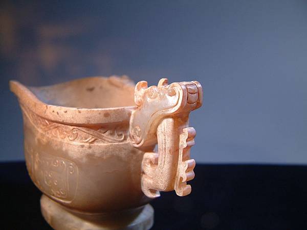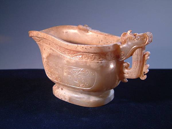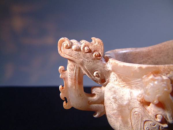 西漢白玉攀螭饕餮紋觥。全器以整塊白玉,掏空中間,再雕刻西漢當代的玉器元素。器左以壓地手法雕出二相對虺龍紋,但合看又成饕餮紋,這算是古代的設計感吧?。器耳由器尾向後伸出一龍頭,在下巴處吐出龍涎,再向內彎轉型成,此造型仿自青銅器的元素。全器大部分表面均已質變白化,少部分仍維持原白玉的玉質,溫潤潔白,玉質甚佳。