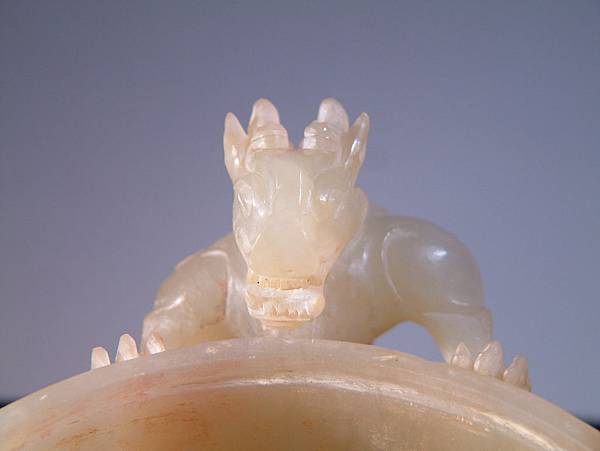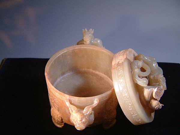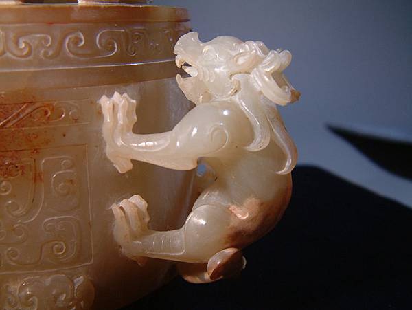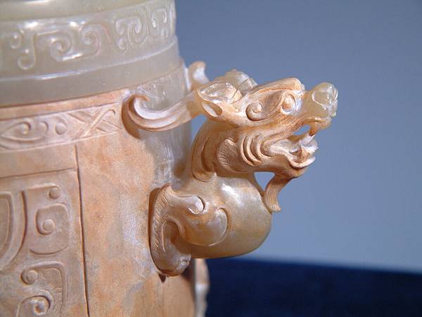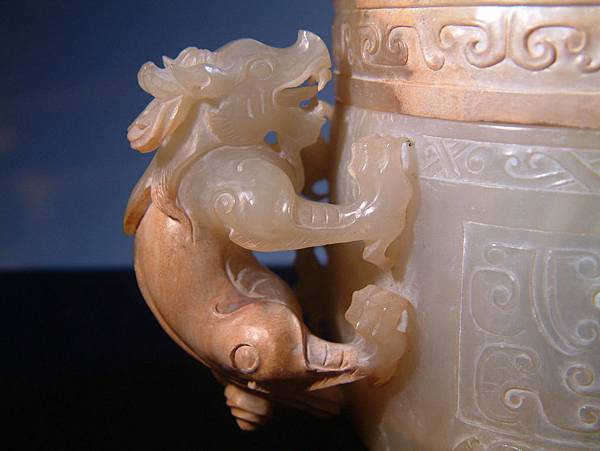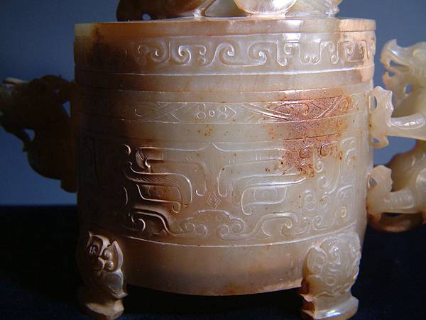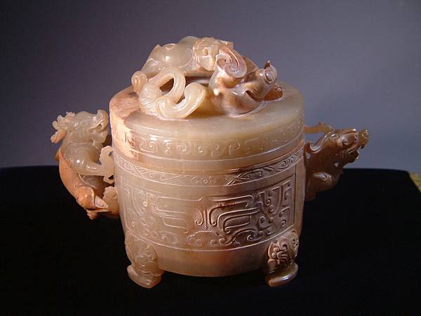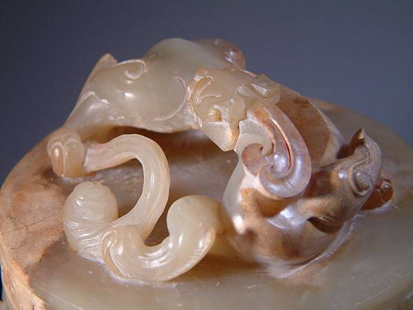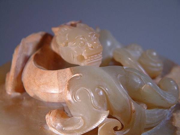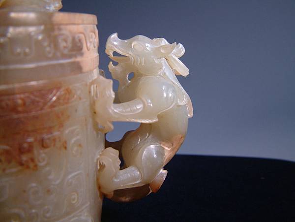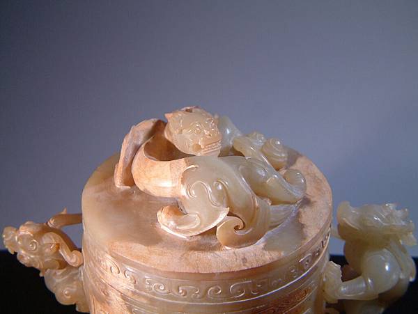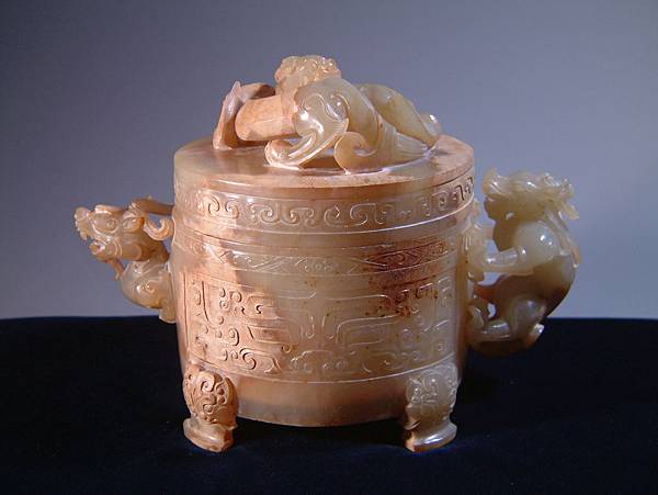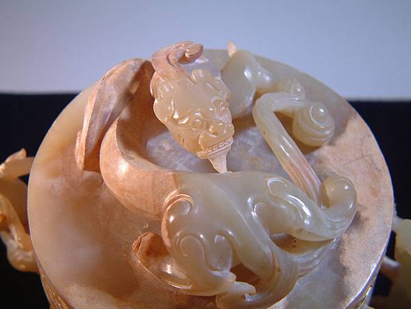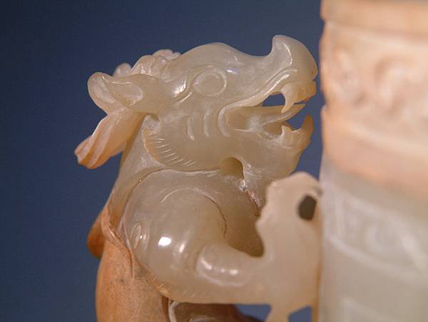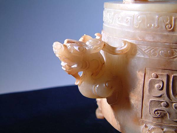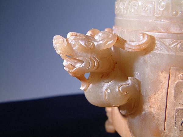 青白玉龍鈕罐。本器分罐體與罐蓋二部份,主體紋飾為兩隻半的龍,罐體一側以圓雕手法雕出一龍前半身,另一側亦以圓雕手法雕出一龍四足攀附於罐壁上。蓋紐亦以圓雕琢出一螭龍,翻轉盤踞於頂,全器主體紋飾以立雕手法雕出栩栩如生的猛龍。器璧另琢有三圈雲氣紋及饕餮紋作為輔飾,亦極為工整,較粗的紋飾中間會打磨略為凹陷,凸浮的圓點也打磨得圓凸。而器側的饕餮紋將吻鼻部、口牙均雕琢出來。本器紋飾精美,型態比較像是罐,故以罐名之。但實與前一篇的「青玉鳳紐卮」極為相似,只不過體型更粗圓而已。