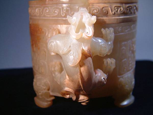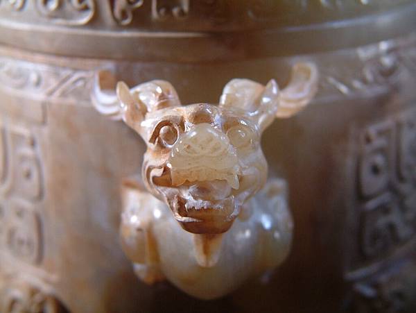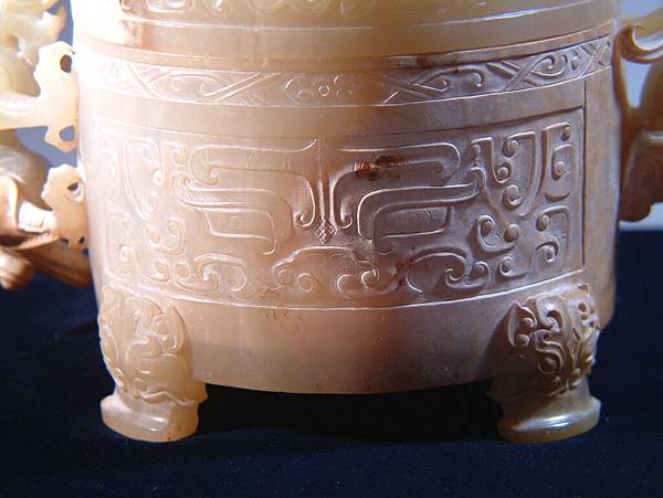 本器器壁上的饕餮紋較完整,除了額頭、眉、眼、鼻、嘴、獠牙等紋飾之外,頭後還雕琢了角、身軀、腳的象徵紋飾,有如春秋時代的整組龍紋。器足則雕小饕餮紋。