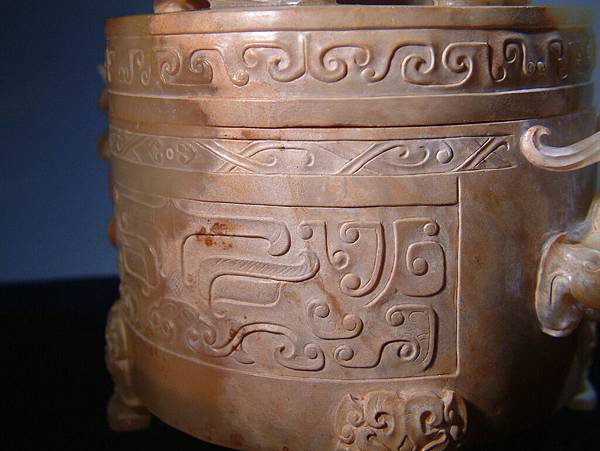 罐壁琢饕餮紋,罐口琢三角雲紋與直條雲氣紋,罐蓋壁則琢勾轉雲紋一週。