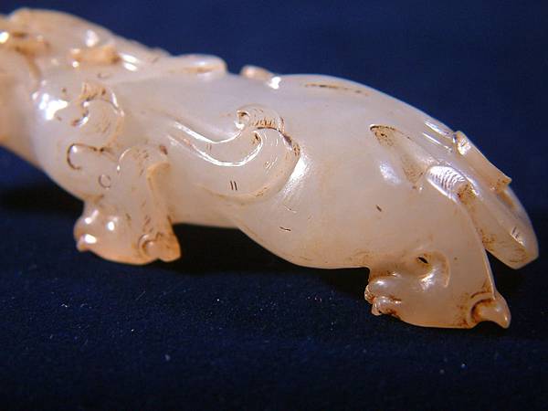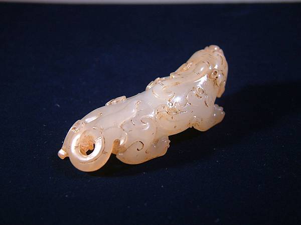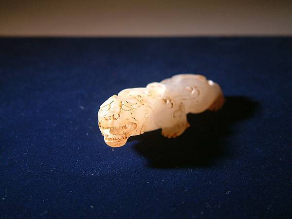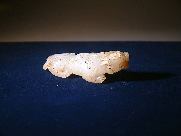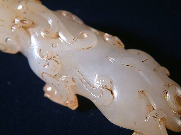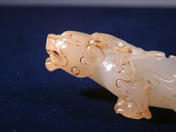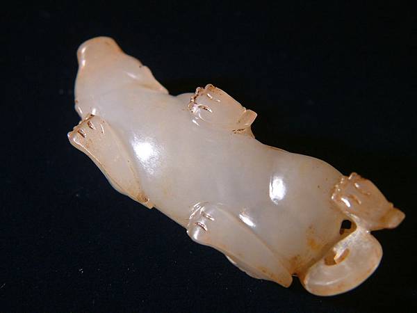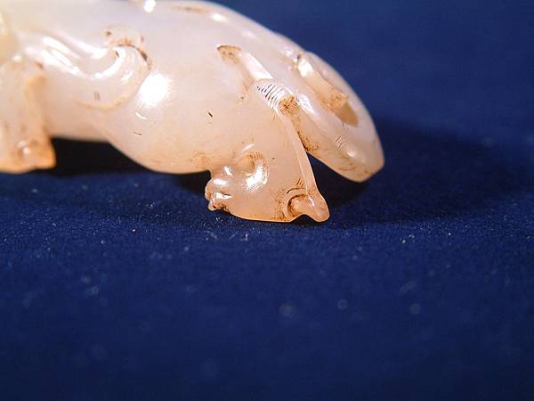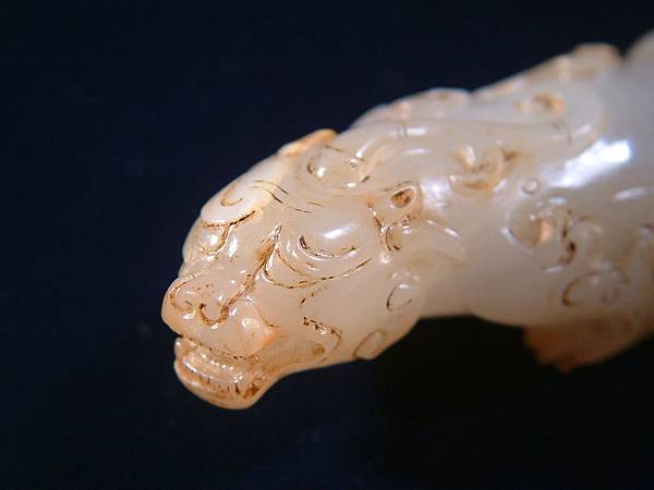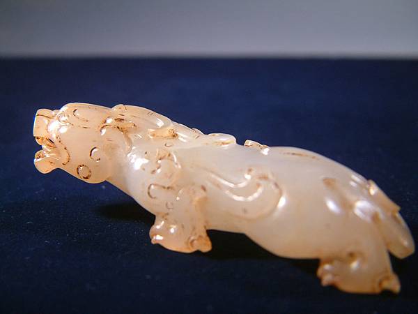 此器可能是西漢中期件,匍匐前進、張口示威,充份掌握西漢玉文化的靈動、有力,與另一篇的「異獸」相比,本器可是神靈活現的多了。本器小巧,但又兇猛有神,全器大磨精緻且光滑寶光流淌,可能是原主隨身佩帶避邪厭勝之物。