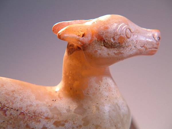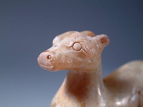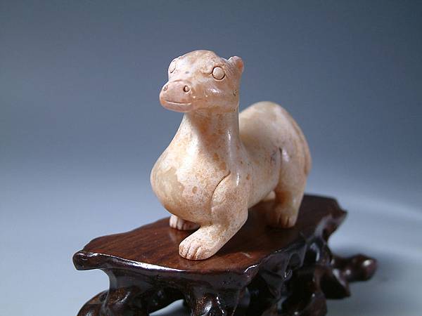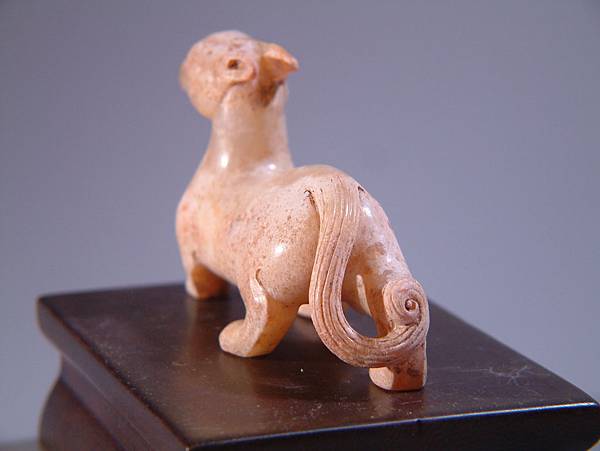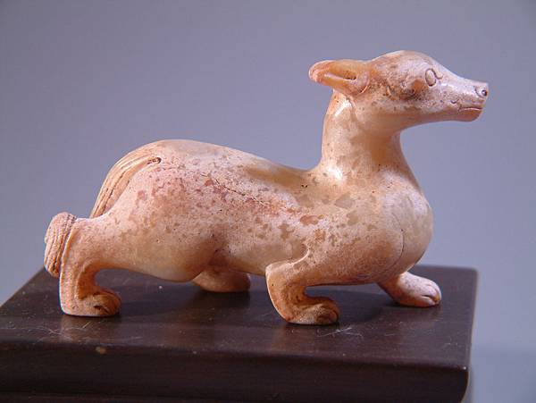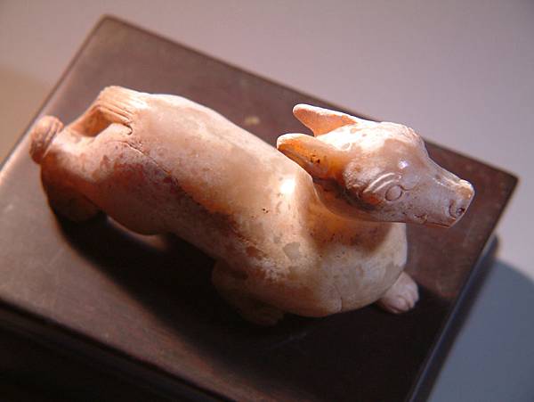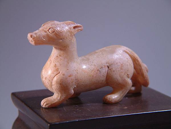 西漢白玉異獸。漢代動物、神獸型態甚多,此器為所見少數較為溫馴之一。各部位比例勻稱、打磨精緻,維持西漢四足支撐身軀、胸腹離地,緩步前行的動態。兩耳後掠,成高度警覺狀。西漢神獸中一般均是頭上有角、背上有翼,肩腿大關節處有火焰紋,但本器全無,故不好定其名為神獸。可說牠是狗?好像又沒這麼平凡。