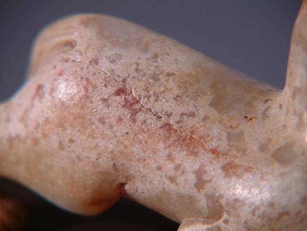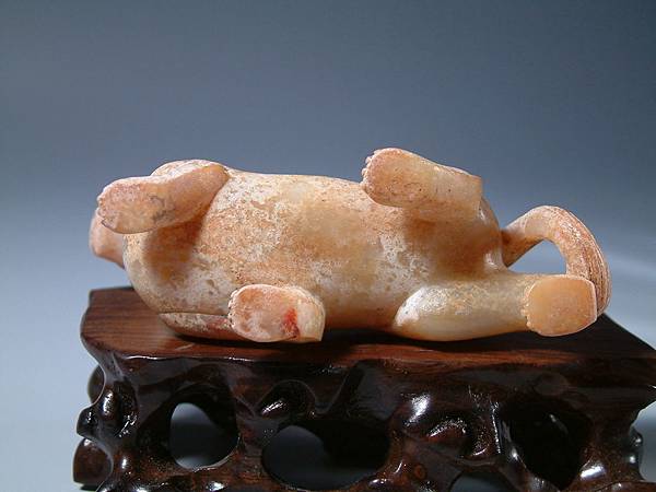 右肩後一玉紋延至尾根部,物質沁入較為明顯。本器獸足行進時左側同時向前,右側前後肢同時在後,此為漢代螭龍行進的模式,本器仍如此定型。現實世界中短肢動物較不可能如此行走,好像只有駱駝這種長腳動物才是同側前後肢同時向前移動。因為短腳動物如此行走必須要讓軀體大幅度扭曲(如S型)才能得到平衡,那身軀必須夠長(像螭龍般的長身軀)。或者一側肢欲向前身體則必須向另一側傾斜,體壓減輕的這一側前後肢才可能同時移動,那這樣的行動必定很慢,現實世界不可能存活。