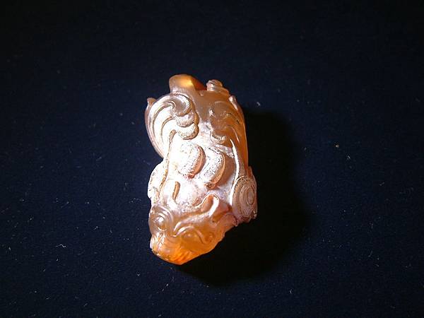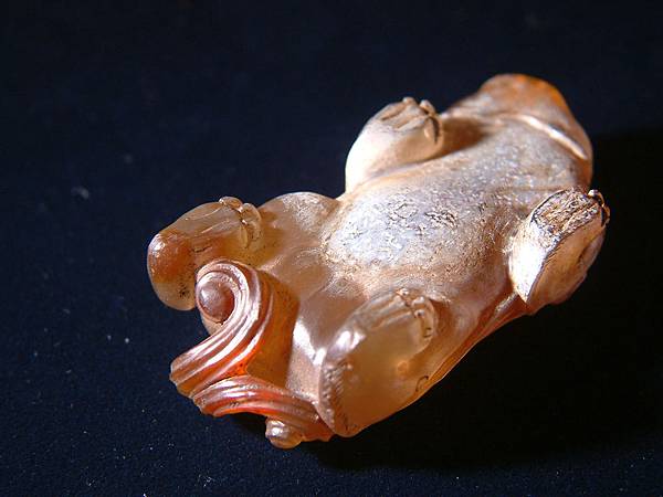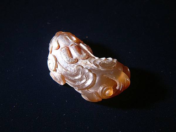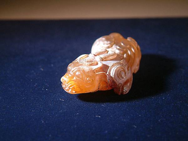 宋黃瑪瑙辟邪。棗形眼,皺鼻齜牙張口,頭後長二角後伸至背中部,翅膀延伸至下背部,足爪尖銳,身軀低伏似在備戰狀態,分岔尾,翅膀、四肢均琢有平行細紋表示細毛。全器漢代辟邪或神獸身上有的元素幾乎一樣不缺,瑪瑙硬度比和闐玉略高,雕工卻是絲毫不茍,可是眾格友是否覺得整體感覺怪異?