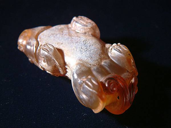 軀中段受白色物質附著,其他部位透明。此辟邪表情十足,玉工已盡力將其雕得兇狠,但比漢辟邪仍少了威猛的氣勢。Why?