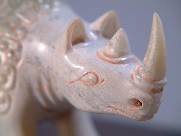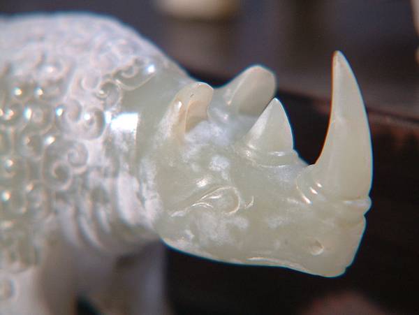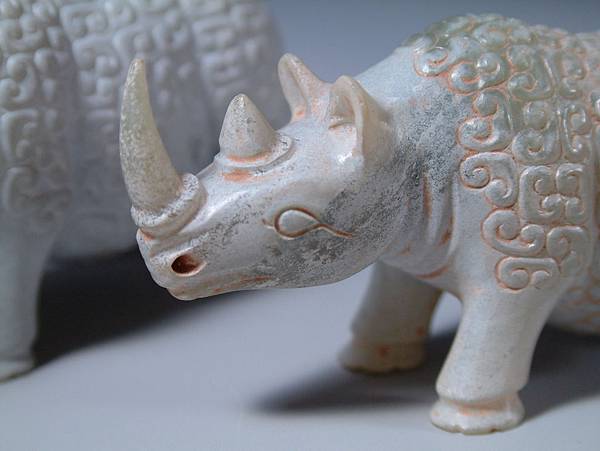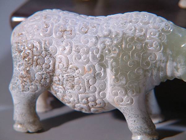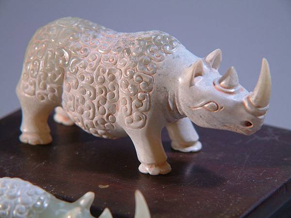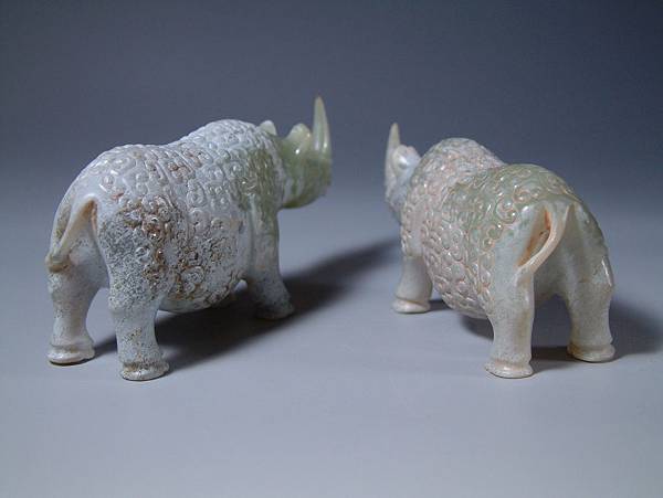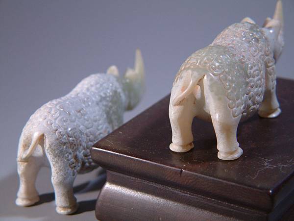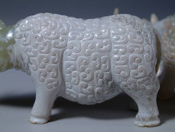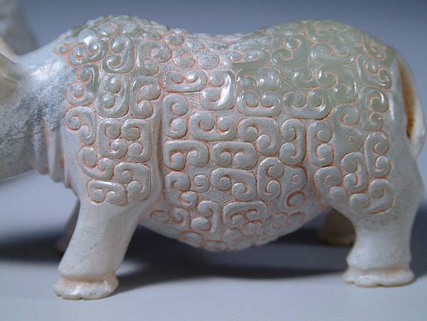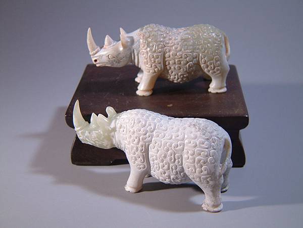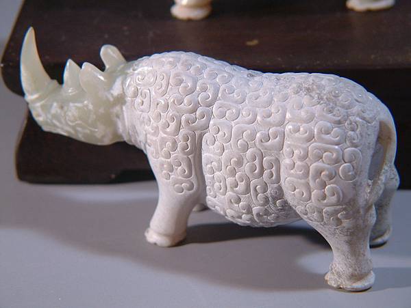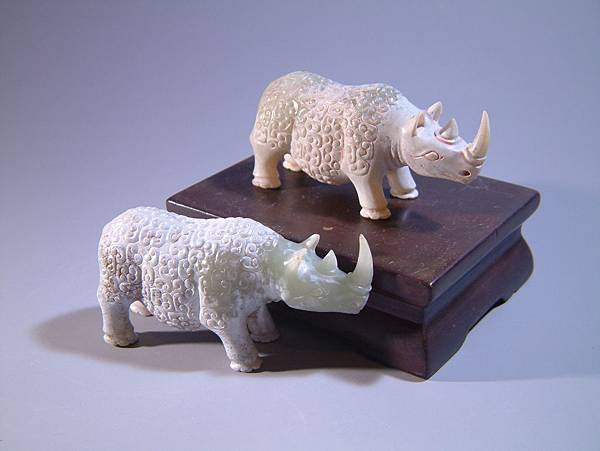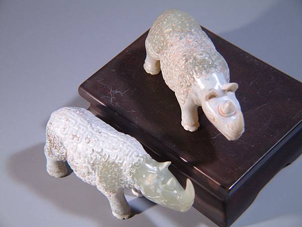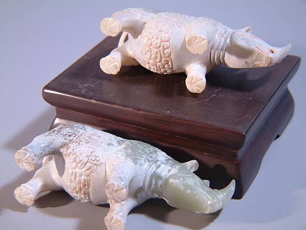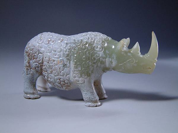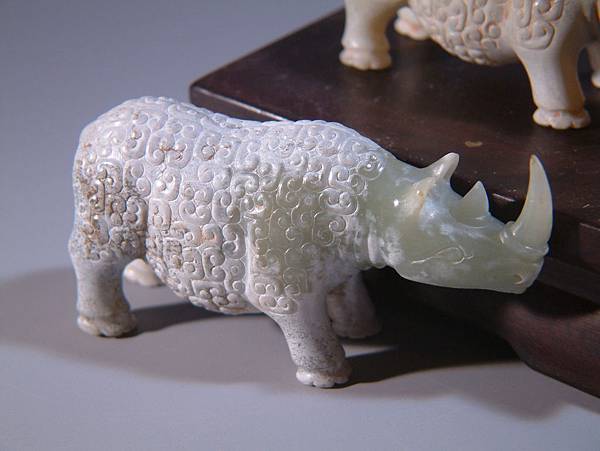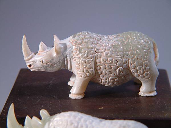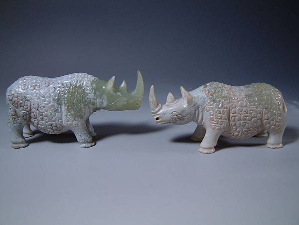 春秋青玉虺龍紋犀牛一對。春秋因崇尚「玉德」,為能方便大量配掛在身上,故一般均將玉料開成片狀,但仍不夠,甚至於將西周以前的玉器改件配戴。所以,製作圓雕此類較耗費玉材之器型,在春秋時期是奢侈中的奢華,幾乎不得見。而成對的圓雕件‧更為稀少。此對青玉犀牛,為亞洲體型,身長較短,各部位比例自然,雕刻師父親眼模擬才可能作得出來,想必當時的中國一定仍留存著犀牛,而且已經被視為珍稀的猛獸。此對犀牛軀幹滿飾虺龍紋,亦或是以螭龍紋來代表雲氣紋,展現其神異的喻意。大部份軀體表層已出現灰皮。上手沉,可能是仔兒玉,青玉質,因為比較接近青銅的顏色為東周的主流顏色。如此精緻的玉器,可能是擺飾,也可能是蓆鎮。