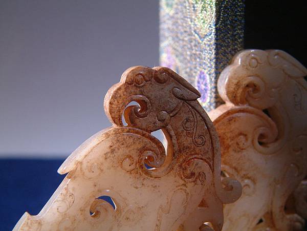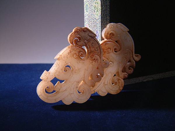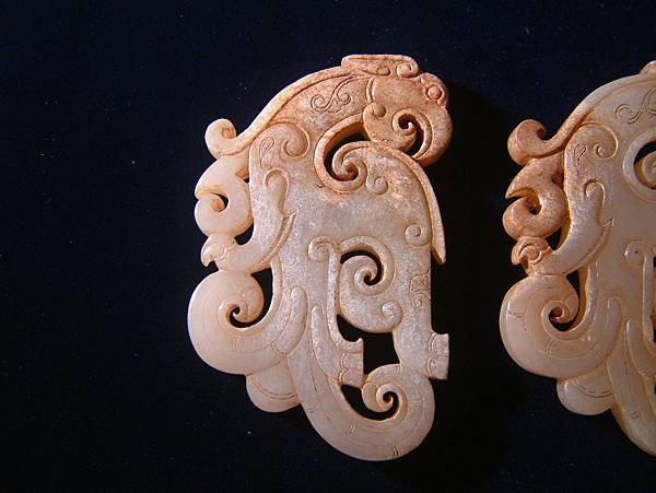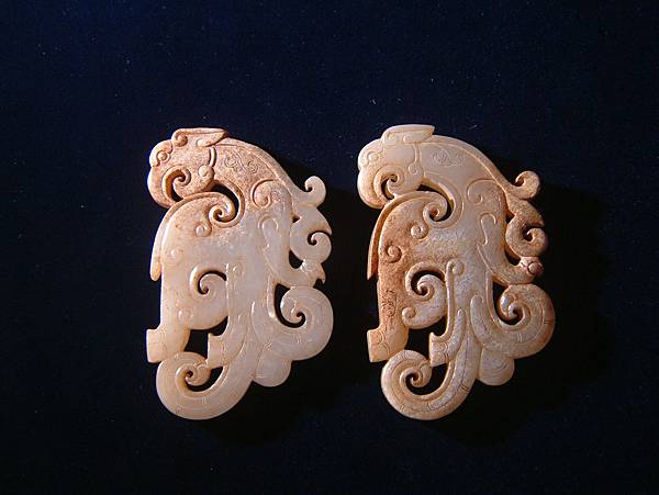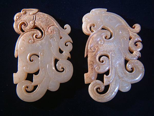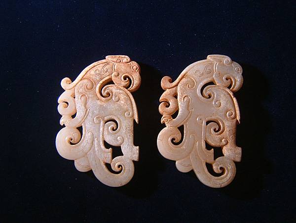 西漢白玉鳳形珮一對。鳳眼圓凸帶梢,嘴彎勾,下巴略呈斧形,用斜廓紋表現其強有力的嘴喙。耳後掠,冠羽亦向後延伸至肩部。頸部近頭部彎弧雙弦紋略為壓地,讓中間浮凸有如圓帶,也將頭部與頸部的視覺在此隔開了。頸部雙陰線琢出一仙花,代表其楚式風格。使用較深之渦卷紋代表其腿關節,雙翅與二腳,只有一腳較具象地表現出來,其他的雙翅與另一腳均用抽象手法表現,展現設計師高超的技巧與特有的審美觀。全器受鐵沁,少部份表面略呈質變,或白化,或呈褐色。照器形及其大小觀之,可能為玉器組中相對的二件。