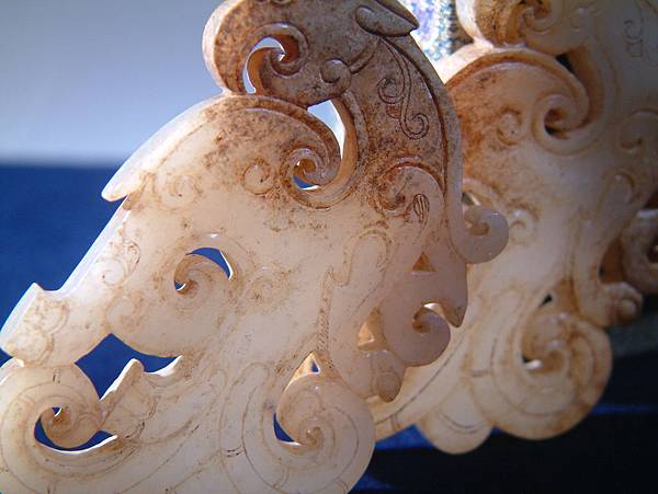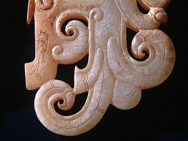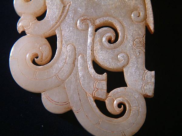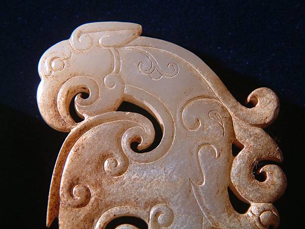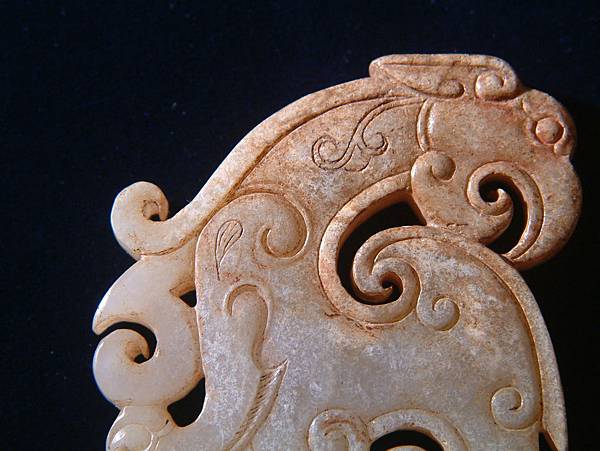 具象的爪子按著的勾卷似羽紋的部份,就是另一抽象的腳爪,有無看到向內勾卷的尖端即有爪紋。右端為其翅膀的延伸,末端向外撇,且有二條弧形陰線隔開長得有點像[象腳趾]。中間也有一向下的斜邊廓紋襯托出末端向右撇的,是其另一抽象的羽翼。全器最下端向右卷的為其尾翼,但與其抽象的腳向左卷的羽紋分岔處向左下琢有一近1/4圓形,此部份又形成了一個楚式[大仙花],可見此設計師對玉器重要元素運用之嫻熟。