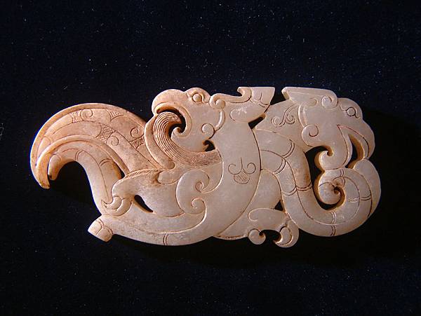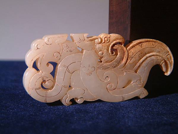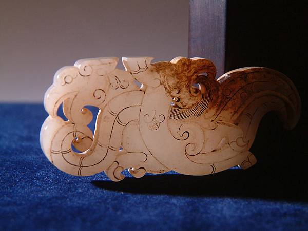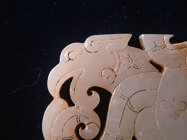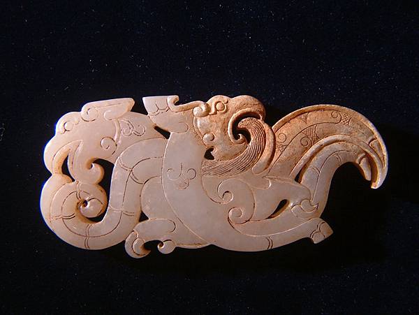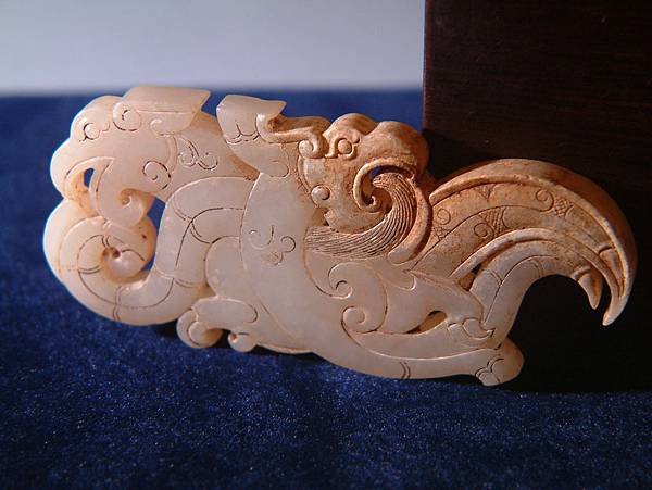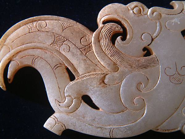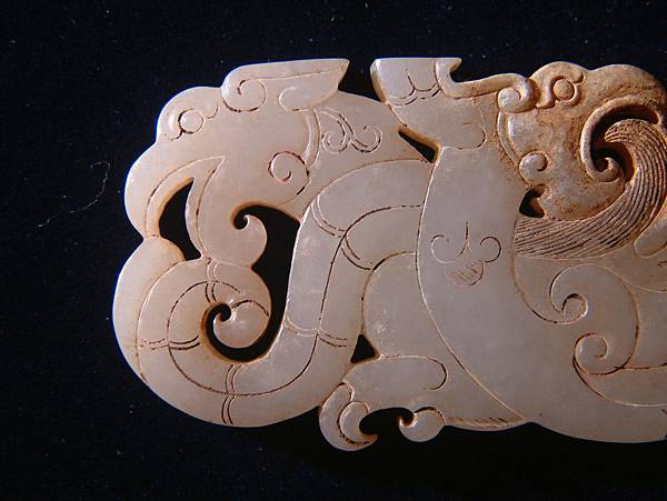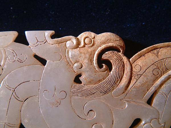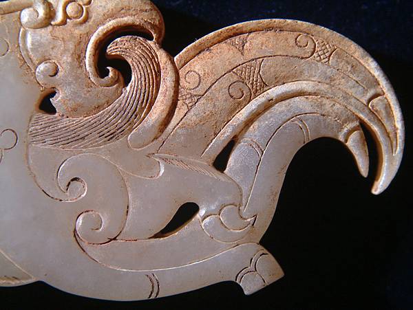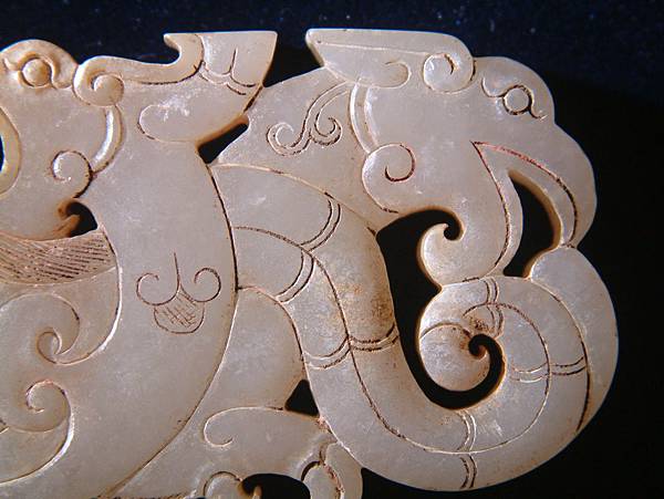 西漢白玉龍鳳交體珮。龍及鳳眼圓睜帶梢,右側鳳嘴喙向下彎勾,似耳又似冠羽向後伏貼,壓地凸起一陽弧線以區隔頭與頸部,頸部雙勾陰線琢卷草紋,肩部由後向前延伸出二道卷雲紋,又似中間龍的尾巴,胸腹處琢前二後一之鳳爪。以長毛紋代表翅膀羽毛,向後上卷至龍嘴,尾翼外側飾以斜廓邊紋,以長弧形弦紋分為上下區塊,間以變形網格紋及卷雲紋表示尾翼繁茂。龍嘴張開,斧形下巴,角向後向上揚起,亦有一壓地陽弧紋區隔頭頸。頸部琢仙花紋表示其具楚國文化之身份,胸部延伸出一靈芝形雲氣紋,具有裝飾其神靈性又可將龍身與其腿隔開之效果,如此引出其向後伸之腿較不會突兀。胸腹向後延伸軀體,類似鳳之尾翼,亦可視為其後腿。但如將鳳之爪借用為龍之前腳,則靈芝紋旁之腳就變成龍的後腿了。本器設計巧妙,多處紋飾以卷曲手法讓觀者之視線不斷地在本器的各部位游走,且其 [借用] 、 [多層次] 、[動感]等手法,運用得淋漓盡致。本器與上篇文章應為同一設計師及玉工製作,亦屬組珮之一,也有一對,只不過當時拍照時未將兩件一起入鏡。