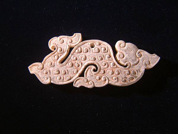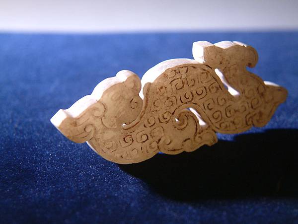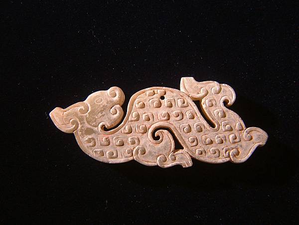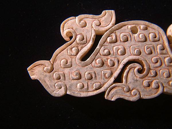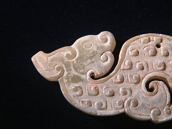 戰國玉器通常均精雕細琢,相當講究 [對稱] 、[平衡] ,因為這些玉器往往是與其他國家締盟、交好時饋贈的 [國禮] ,就是當時亂世國家的[買命禮品]。但常有種表現手法,讓wake覺得有點矛盾,這些玉器器形雖小,但紋飾、打磨尚稱精緻,可是其器形明顯可看出是將就著玉料片下的的原型所設計而成,讓人有種玉工捨不得去掉玉料的感覺,猜測是否因為戰國時 [秦] 雄霸西方,控制了新疆的玉原料進入中原,故戰國其他諸國玉原料就少了的緣故,讓秦東諸國的玉工不得不 [工就料型] ?全器表面白化灰皮,細縫中仍留有硃砂。