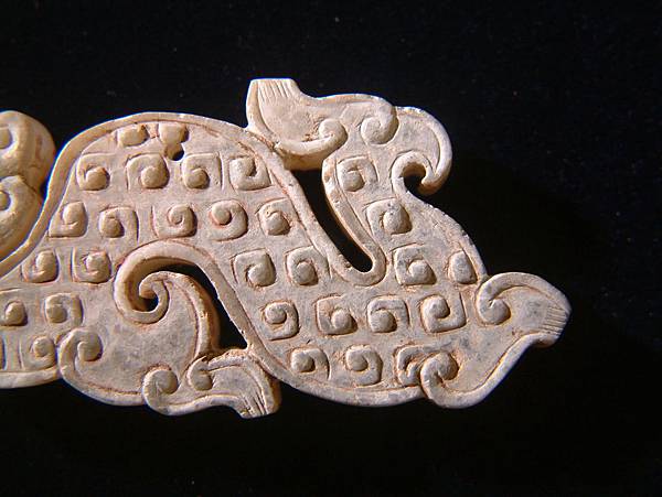 去除龍頭,這樣看就很清楚的見到鳳。龍尾端的足紋,亦被變形鳳 [借用] 為其冠羽,這種手法延續至漢代。 本件玉器設計感、穀紋的浮凸(也就是穀紋周邊的地子均勻地打磨掉較厚的一層)均佳,但穀紋的圓潤度卻似乎被刻意地忽視。