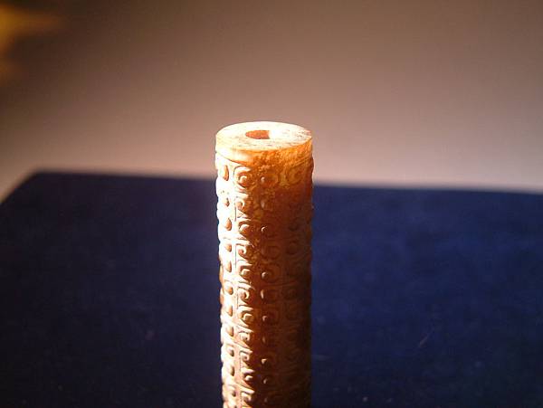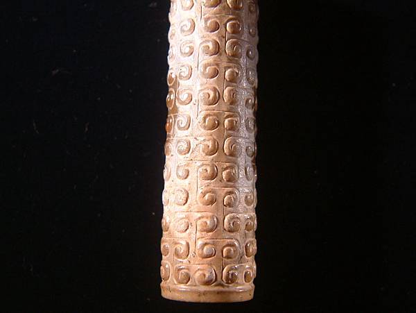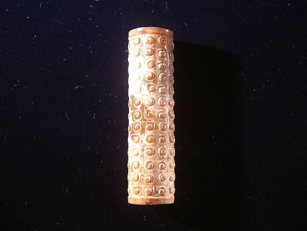 戰國丁勾穀紋勒子,紋飾、工法與上器類似,穀紋圓滿、工整,大部份器表灰皮白化。本器紋飾為戰國玉器常用紋飾,可作標準器。