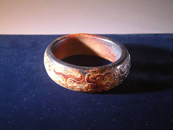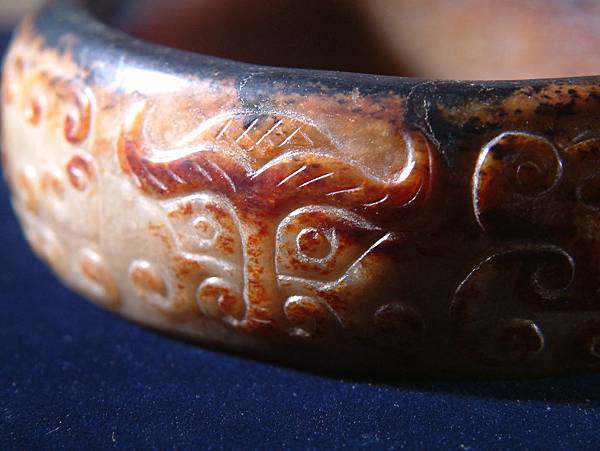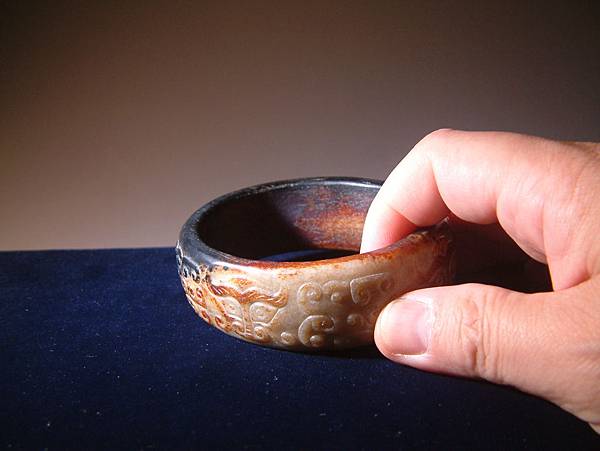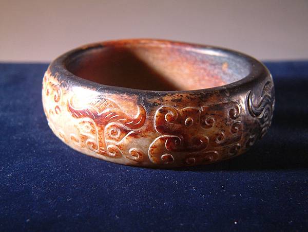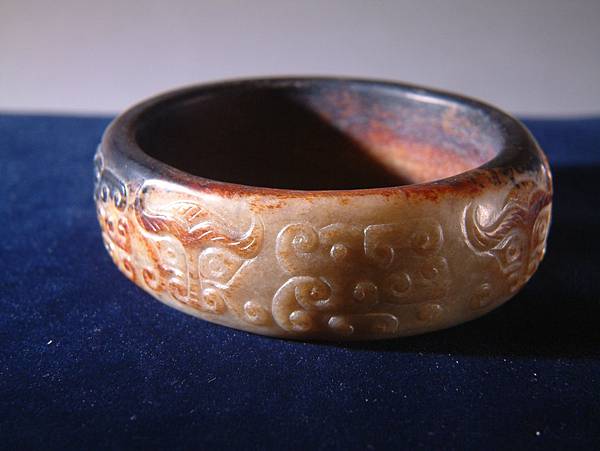 戰國前期白玉饕餮龍紋鐲。本器紋飾為饕餮、龍紋組交相排列。上手沉,和闐白玉質,全器表面受紅、黑二色沁擾,沁色自然。風格略粗獷,為手腕、手臂飾品。
