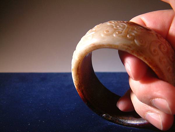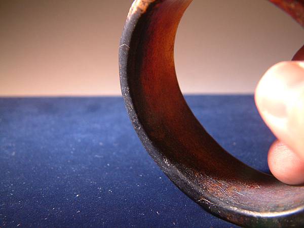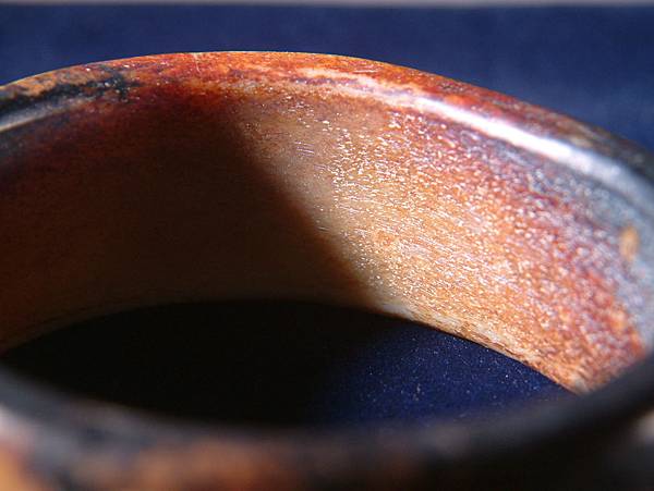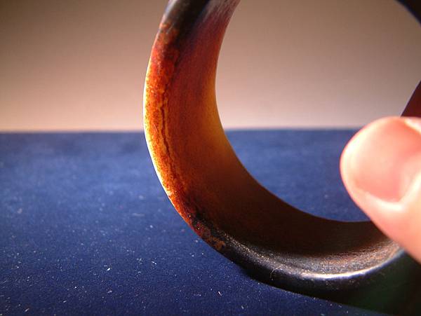 此照片可看到,左側外緣皮膚較少接觸之處,仍呈白色,但內緣均已受沁。