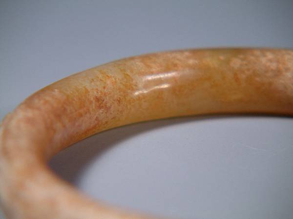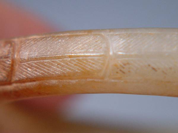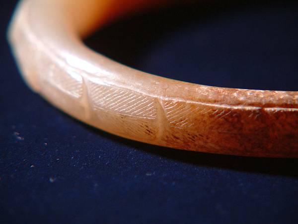 西漢白玉羽紋手環,圓形手環,外側琢十七片羽紋,橫截面為圓形。受褐色沁,部份表面呈點狀白化現象。