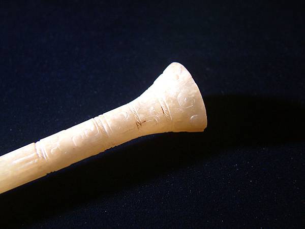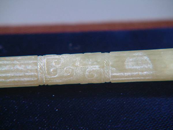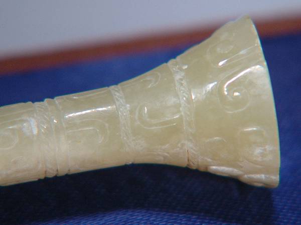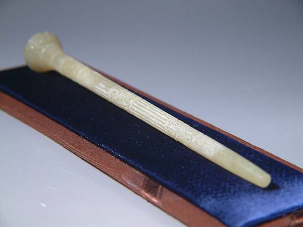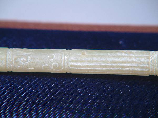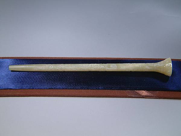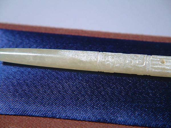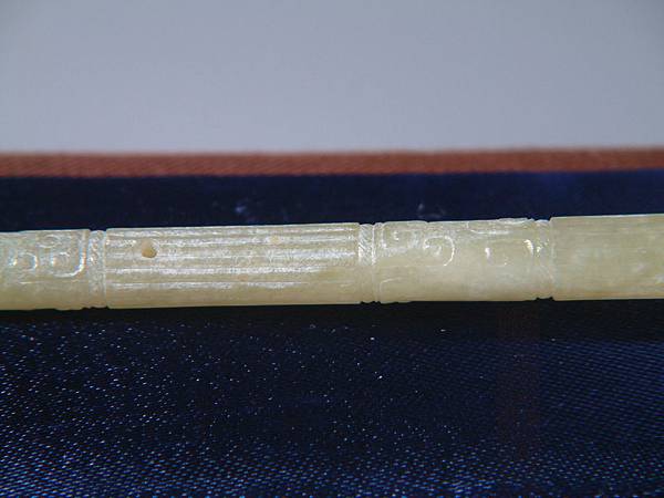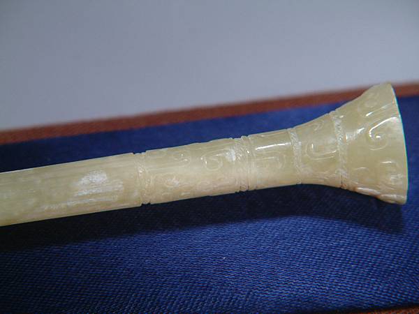 全器筆直,表層略有白化現象,青白玉略帶黃色,光澤潤透,為春秋的標準用玉。