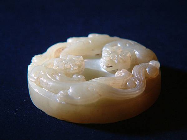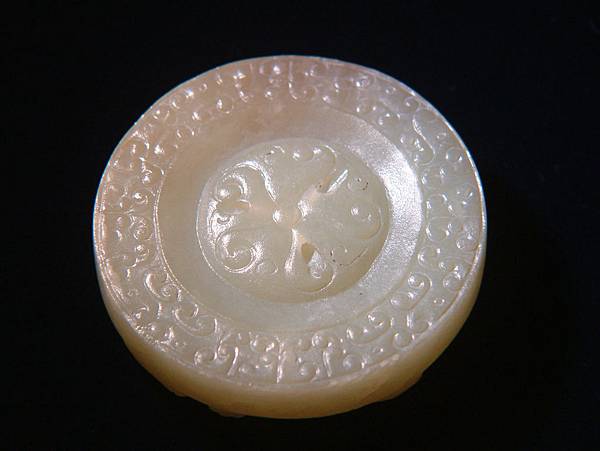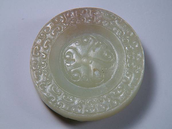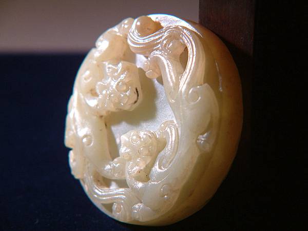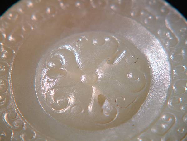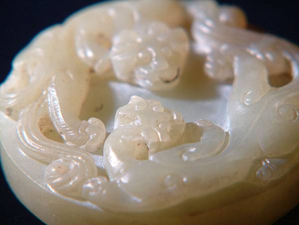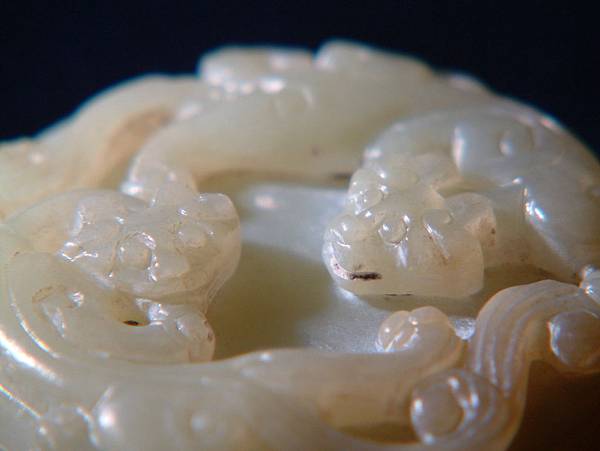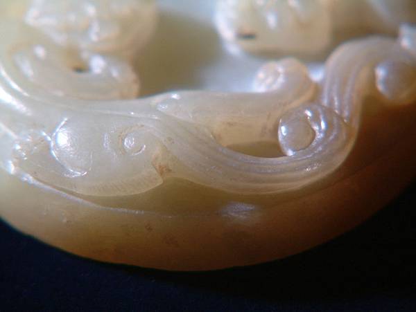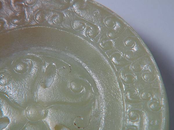 所以分享此器,是因為其原樣與現在格友所見大不相同。二十七、八年前初購藏時,全器灰灰的光澤較差,拿放大鏡細觀其紋路時,不小心撞傷了螭尾的表面。心理正懊惱時,發現傷口有些細粉屑。心想,也不過是塑膠質的放大鏡輕輕撞一下,怎會讓玉粉碎了?拿指甲輕輕摳一下,居然一小片灰皮脫落了,露出下面潤透的玉質。眼見已回不了頭,乾脆拿了豬鬃刷「武盤」了起來。有經驗的格友就可以想像到,接下來灰塵滿身,硬是將約0.1公分厚的灰皮刷掉,露出現在各位看到的樣子。右邊那隻螭龍的嘴線中還留下一點未刷完的灰。這也就是本器表面有些麻麻的,但光澤卻仍強的原因。