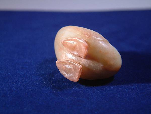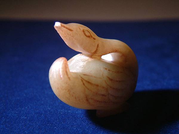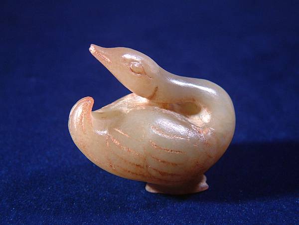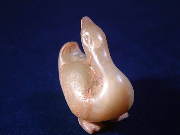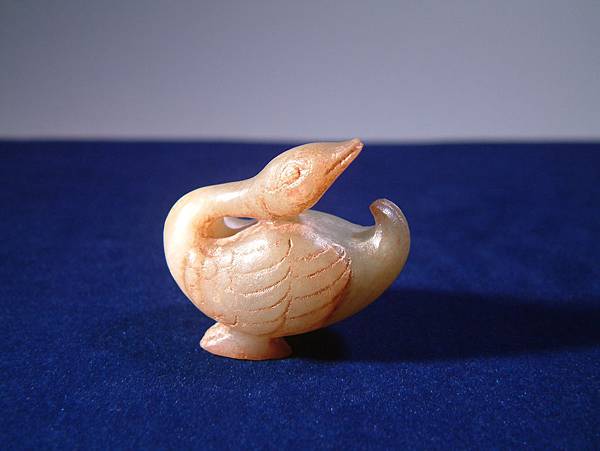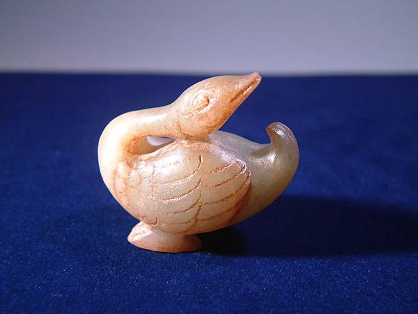 遼金青白玉大雁珮。青白玉質,肖生佩飾器,似捉住大雁整理完羽毛剛抬起頭仰望之剎那間的神情。頸後彎,兩翅緊收,尾羽上翹,體態均勻,很是可愛。紋飾不求華麗,僅以粗陰線很自然地交待羽紋及翅羽。全身數處風化斑剝。折頸處形成繫洞,可能是隨身手把件。