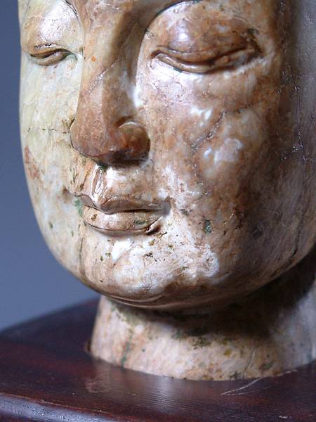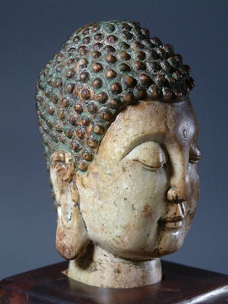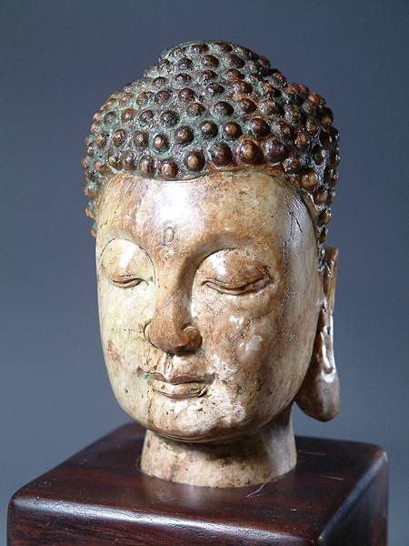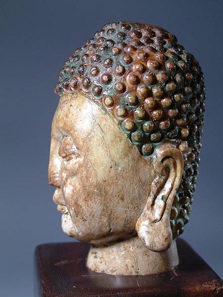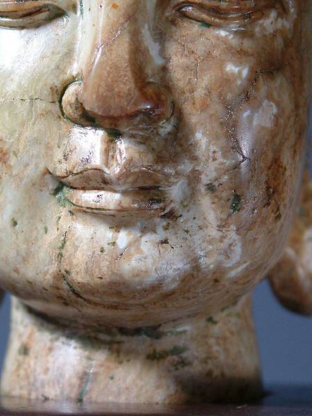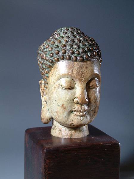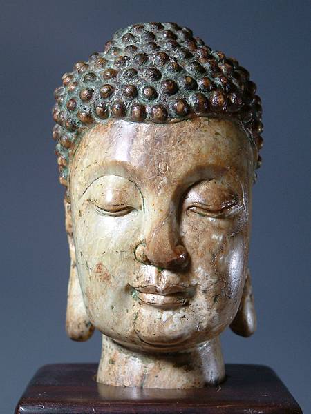 唐代白玉佛首。和闐白玉,初購藏時全器佈滿銅鏽,差點誤認為青銅佛首。下端斷面打磨平整,應是原本即是選用和闐白玉製作佛首,再配接銅質佛身,以供人膜拜。法像莊嚴,面容豐盈,為漢化面容。初看時,佛似有似無的笑意,但久視眼鼻之間,笑容漸斂,只見莊嚴慈悲。