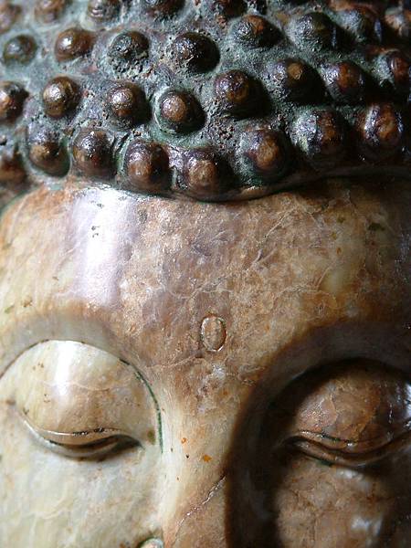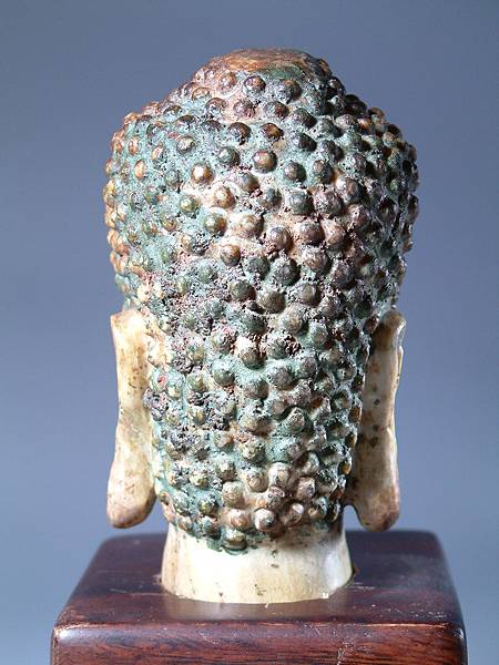 剛購藏此佛首時,還真沒把握。上手很沉,感覺實心,全器均被銅綠繡完整的包了一層。原以為是銅質,但從髮髻部份頂端窺見銅綠繡下似為白色,又在嘴角處掉落一塊銅綠繡,露出鏽下的白玉,遂硬著頭皮將臉上的銅綠銹用竹片輕輕刮除,方才顯示出玉佛精緻莊嚴的面容。