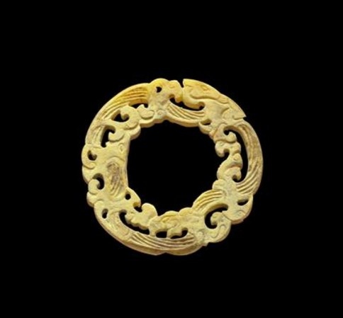 西漢黃玉龍鳳紋雲氣瑗。和田黃玉質,玉質堅硬潤透,沉手,應是和田玉種中最為堅硬的一種玉質,輕敲會產生「叮叮」的金屬聲。下方有一沁蝕較重部份,周邊未白化處有漸淡的褐色金屬離子沁入。本件雙面透雕三龍頭紋,二龍頭方向一致與上方龍頭相對,右側中間之龍頭僅雕琢出龍眼,上下二龍頭翹鼻、棗形眼、張口露出上下獠牙,形象威猛。令琢出兩種雲氣紋貫穿全器,一種為絞繩紋型態,如同一股浩然大氣循環於天地之間,生生不息,卓然不斷。另一種為圍繞在絞繩紋雲氣周邊的雲氣,繚繞恣意,向外發散,澤被四方,有時形成如意雲頭,盡顯祥瑞,有時又化身鳳鳥(七點鐘方位),隱隱與龍相隨。本件玉瑗造型與廣州南越王墓出土的「玉龍紋環」極為相似,但細觀龍頭卻有頗大差異。
